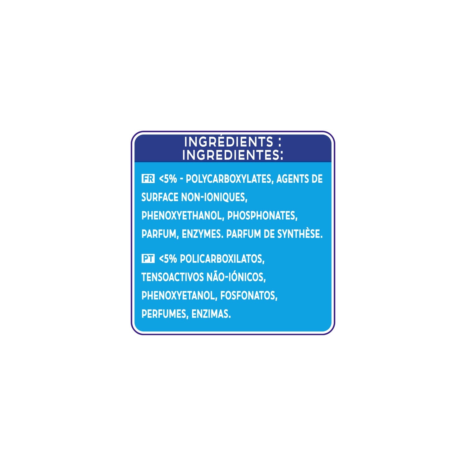 INHALTSSTOFFE: <5 % – POLYCARBOXYLATE, NICHTIONISCHE OBERFLÄCHENMITTEL, PHENOXYETHANOL, PHOSPHONATE, PARFÜM, ENZYME.