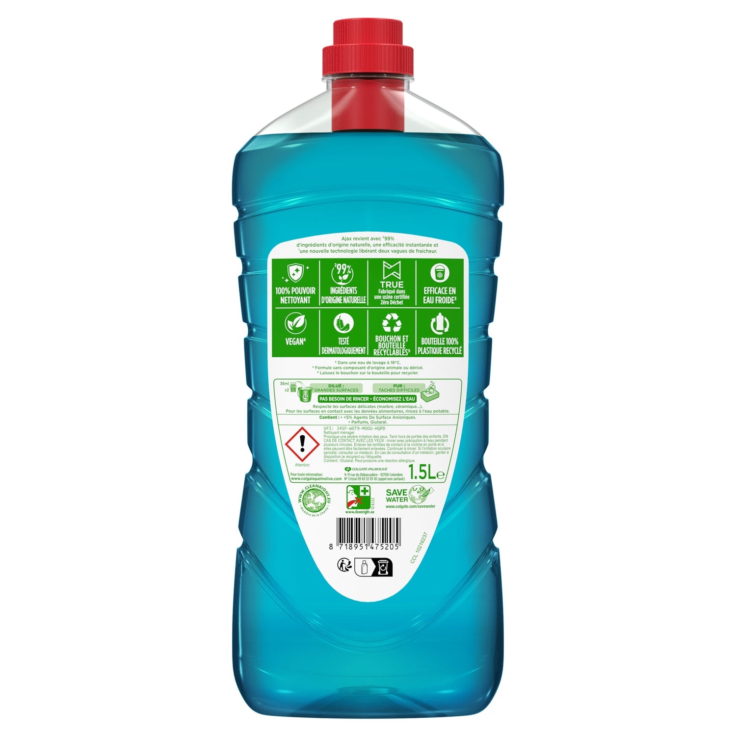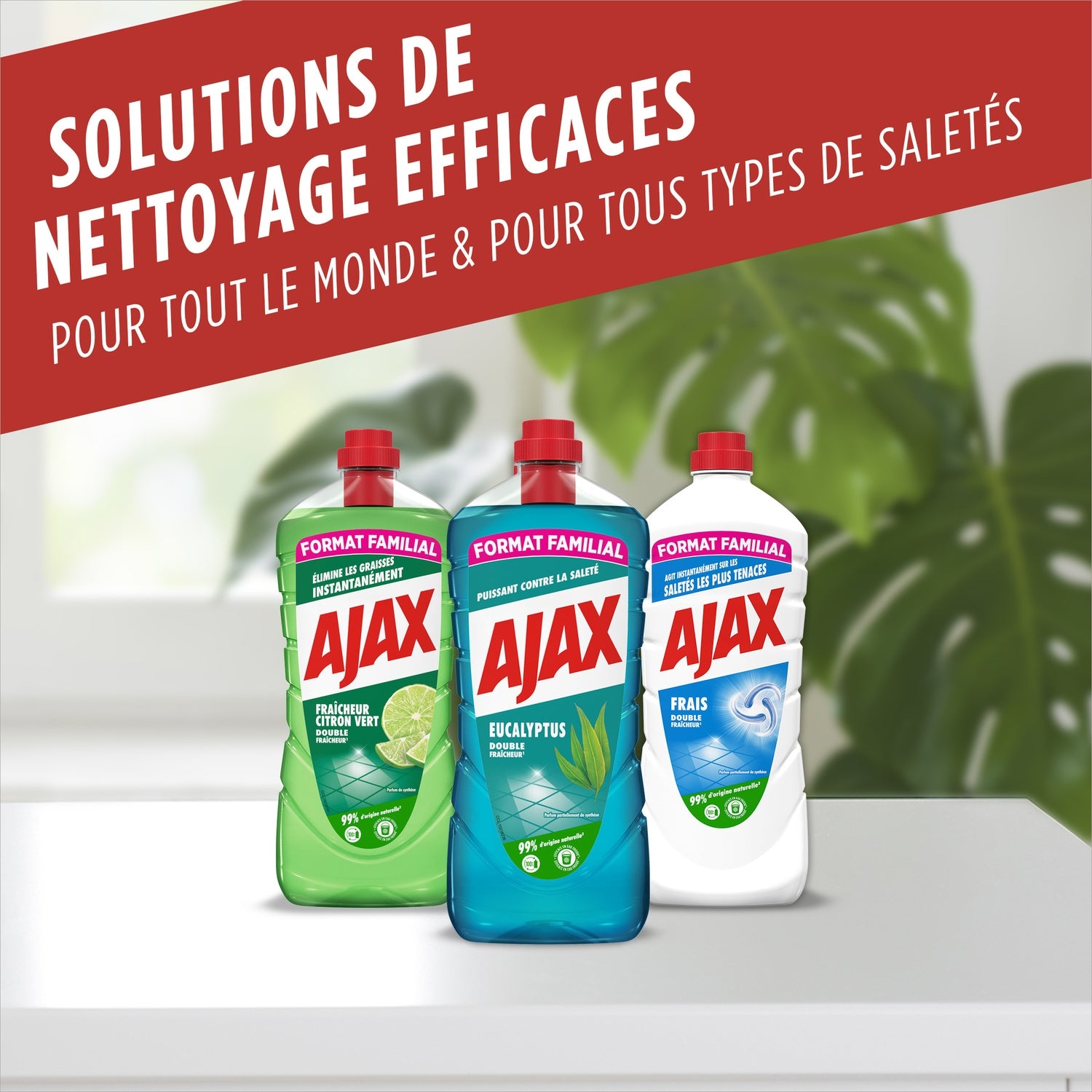 Der Ajax Eukalyptus-Reiniger für mehrere Oberflächen bietet 100 % Reinigungskraft und beseitigt Schmutz sofort. Er verfügt über die Dual-Fresh-Technologie, die zwei Frischewellen freisetzt.