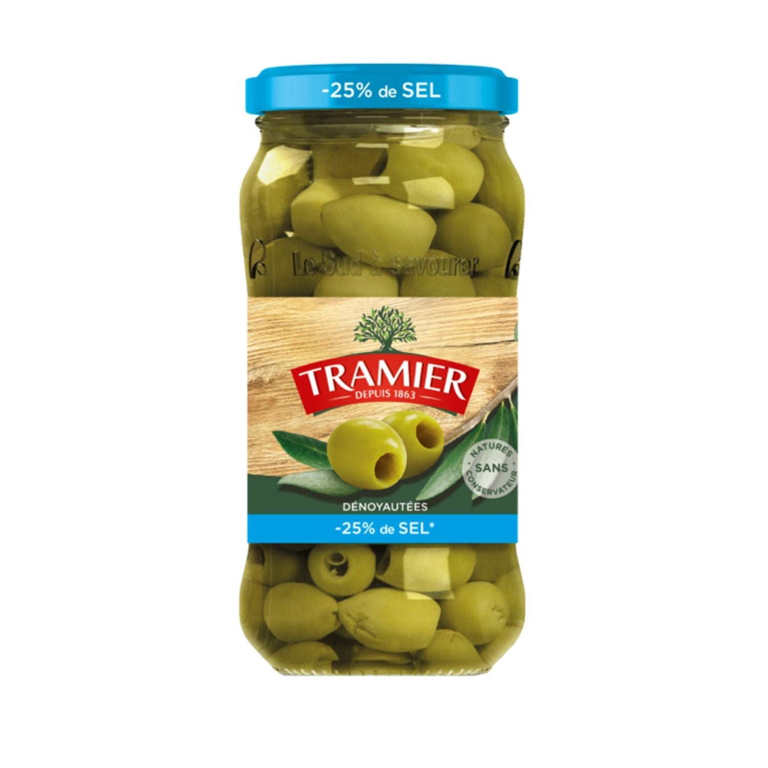 Entsteinte grüne Oliven mit reduziertem Salzgehalt TRAMIER