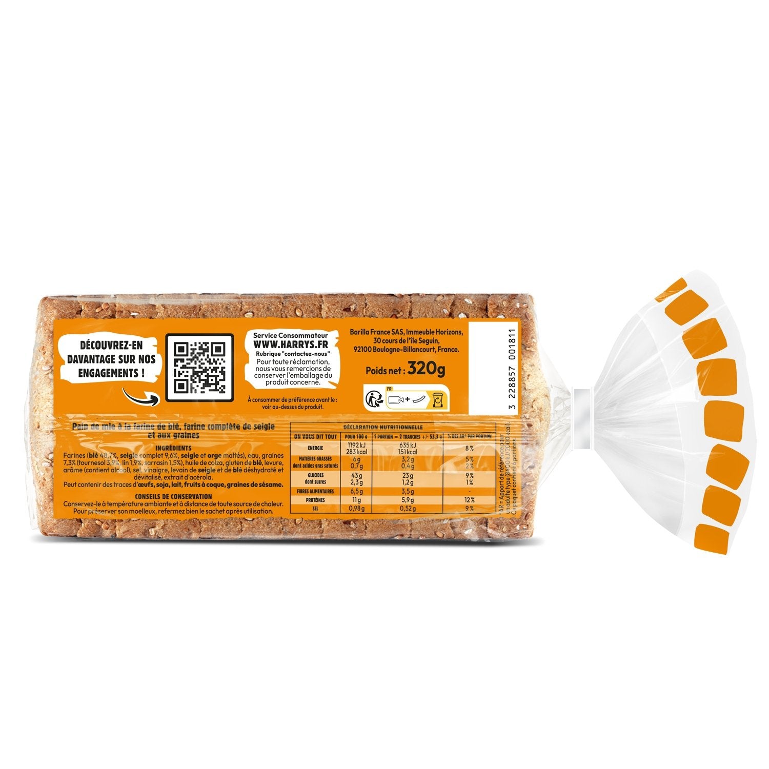 Mehl (WEIZEN 48,7%, VollkornROGGEN 9,6%, ROGGEN- und GERSTENMALZ), Wasser, Saaten 7,3% (Sonnenblumen 3,9%, Leinsamen 1,9%, Buchweizen 1,5%), Rapsöl, WEIZENGLUTEN, Hefe, Aroma (enthält Alkohol), Salz, Essig, dehydrierter und devitalisierter ROGGEN- und WEIZENSauerteig, Acerola-Extrakt. Kann Spuren von EIER, SOJA, MILCH, NÜSSEN, SESAM und LUPINEN enthalten.