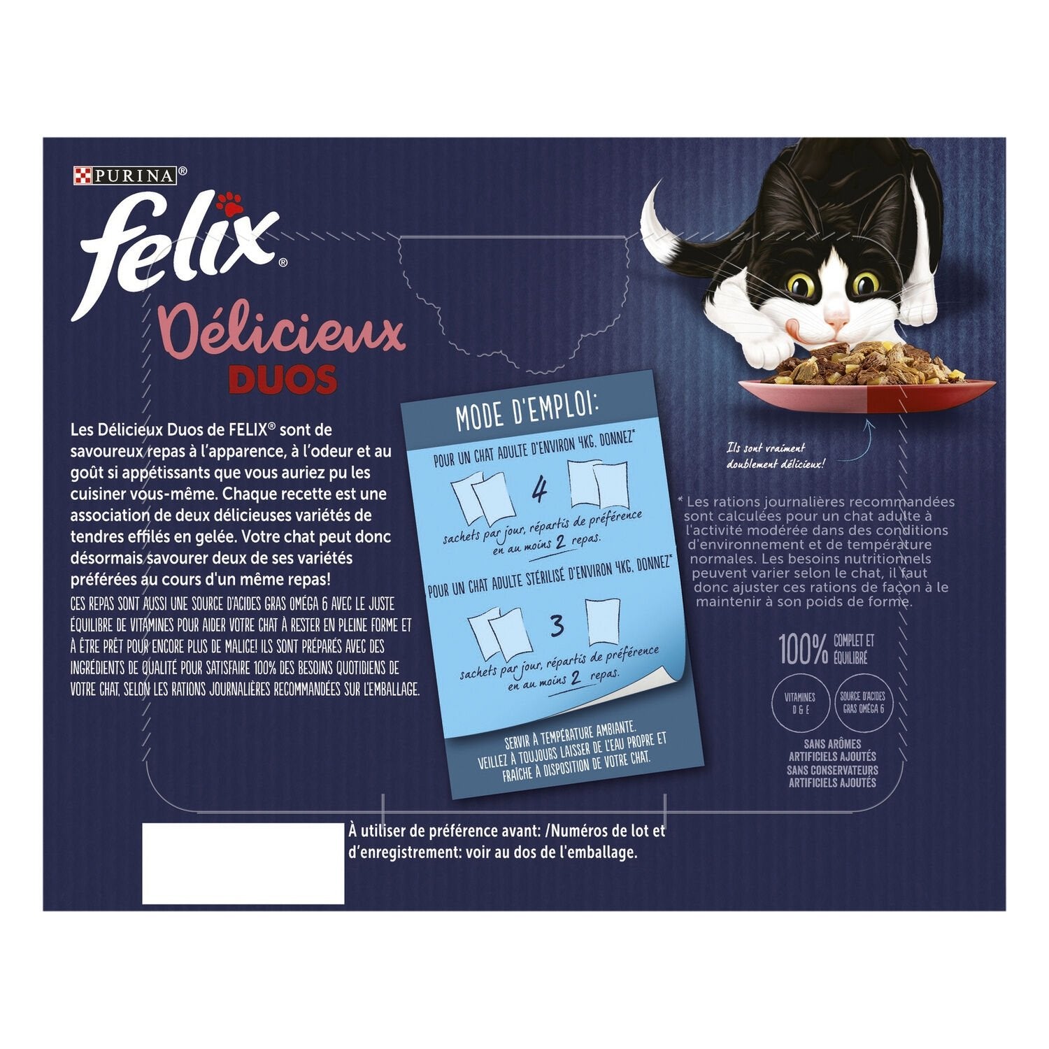 FELIX® Delicious Duos sind köstliche Mahlzeiten, die so gut aussehen, riechen und schmecken, als hätten Sie sie selbst zubereitet. Jedes Rezept kombiniert zwei köstliche Sorten zarter Schnitzel in Gelee, sodass Ihre Katze jetzt zwei ihrer Lieblingssorten in einer Mahlzeit genießen kann! Diese Mahlzeiten sind außerdem eine Quelle für Omega-6-Fettsäuren mit genau der richtigen Vitaminbalance, damit Ihre Katze in Topform bleibt und für noch mehr Unfug bereit ist! Sie werden aus hochwertigen Zutaten hergestellt, um den Tagesbedarf Ihrer Katze gemäß der auf der Verpackung empfohlenen Tagesmenge zu 100 % zu decken. Und das ist noch nicht alles! FELIX® Delicious Duos sind in einer Vielzahl köstlicher Rezepte in Gelee erhältlich, um den Wunsch Ihrer Katze nach Abwechslung zu stillen. Sie sind wirklich doppelt lecker! FELIX®, so unwiderstehlich