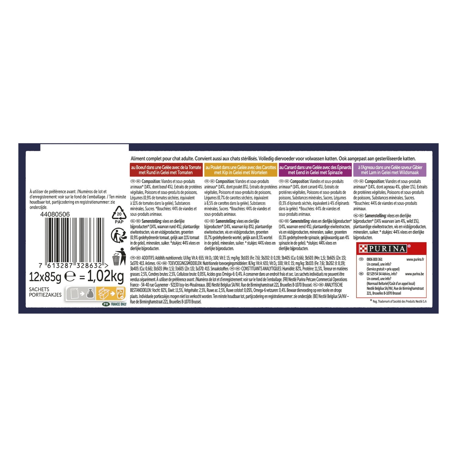 Zusammensetzung: Lamm und Wild: Fleisch und tierische Nebenerzeugnisse* (14 %, davon Lamm 4 %, Wild 1 %), pflanzliche Eiweißextrakte, FISCH und FISCHNebenprodukte, Mineralstoffe, Zucker. *Happen: 44 % Fleisch und tierische Nebenerzeugnisse. Ente und Spinat: Fleisch und tierische Nebenerzeugnisse* (14 %, davon Ente 4 %), pflanzliche Eiweißextrakte, FISCH und FISCHNebenprodukte, Mineralstoffe, Zucker, Gemüse (0,3 % getrockneter Spinat, entspricht 4 % Spinat in Gelee). *Happen: 44 % Fleisch und tierische Nebenerzeugnisse. Huhn und Karotten: Fleisch und tierische Nebenerzeugnisse* (14 %, davon Huhn 8 %), pflanzliche Eiweißextrakte, FISCH und FISCHNebenprodukte, Gemüse (0,7 % getrocknete Karotten, entspricht 8,5 % Karotten in Gelee), Mineralstoffe, Zucker. *Happen: 44 % Fleisch und tierische Nebenerzeugnisse. Rindfleisch und Tomaten: Fleisch und tierische Nebenerzeugnisse* (14 %, davon Rindfleisch 4 %), pflanzliche Eiweißextrakte, FISCH und FISCHNebenerzeugnisse, Gemüse (0,9 % getrocknete Tomaten, entspricht 11 % Tomaten in Gelee), Mineralstoffe, Zucker. *Happen: 44 % Fleisch und tierische Nebenerzeugnisse.