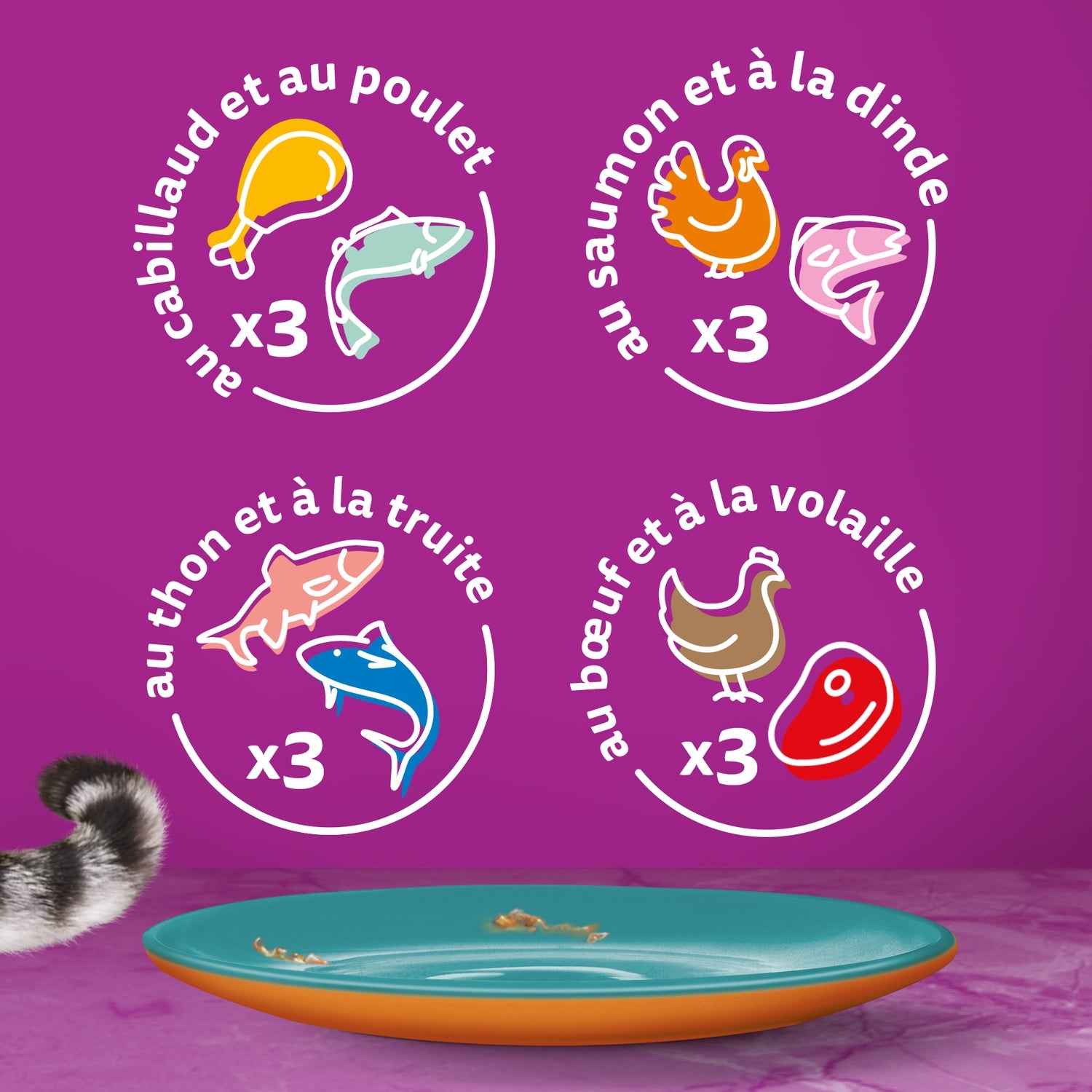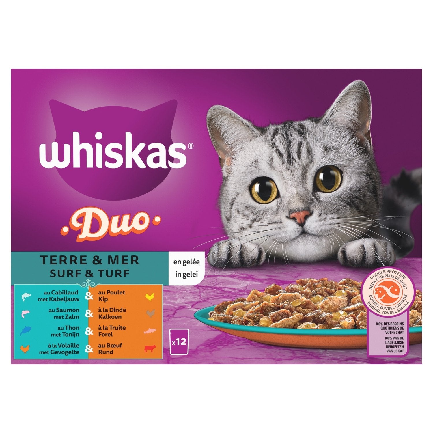 Adult Katzenfutter in Gelee Kabeljau Huhn Lachs Truthahn Thunfisch Forelle Duo Land Meer WHISKAS