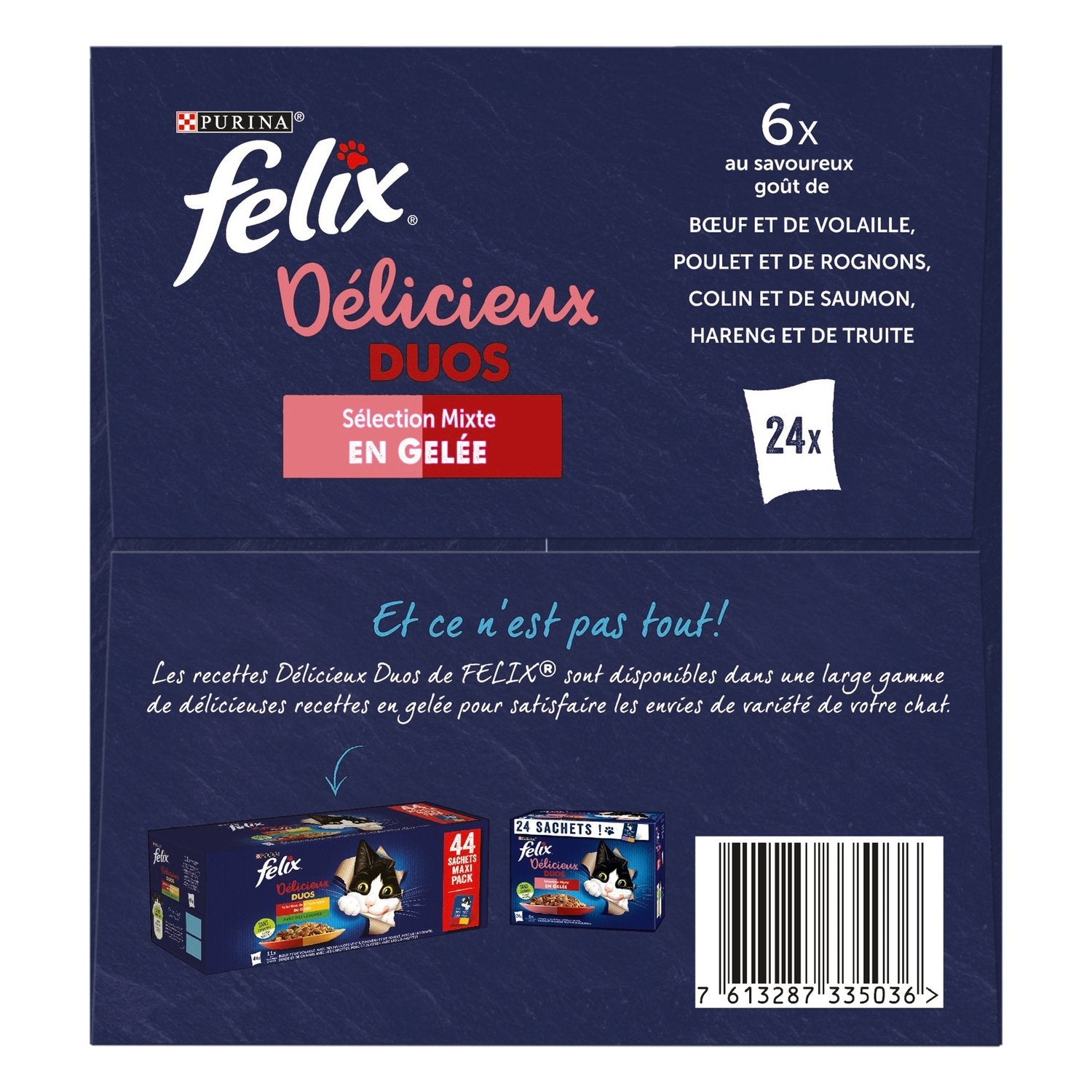 FELIX Delicious Duos sind köstliche Mahlzeiten, die so lecker aussehen, riechen und schmecken, als hätten Sie sie selbst zubereitet. Jedes Rezept kombiniert zwei leckere Sorten zarter Schnitzel in Gelee, sodass Ihre Katze jetzt zwei ihrer Lieblingssorten in einer Mahlzeit genießen kann! Diese Mahlzeiten sind außerdem eine Quelle für Omega-6-Fettsäuren mit genau der richtigen Vitaminbalance, damit Ihre Katze in Topform bleibt und zu noch mehr Unfug bereit ist! Sie werden aus hochwertigen Zutaten hergestellt, um den Tagesbedarf Ihrer Katze gemäß der Tagesdosis auf der Verpackung zu 100 % zu decken. Und das ist noch nicht alles! FELIX Delicious Duos sind in vielen leckeren Rezepturen in Gelee erhältlich, um den Appetit Ihrer Katze auf Abwechslung zu stillen. Sie sind wirklich doppelt lecker! FELIX, so unwiderstehlich!