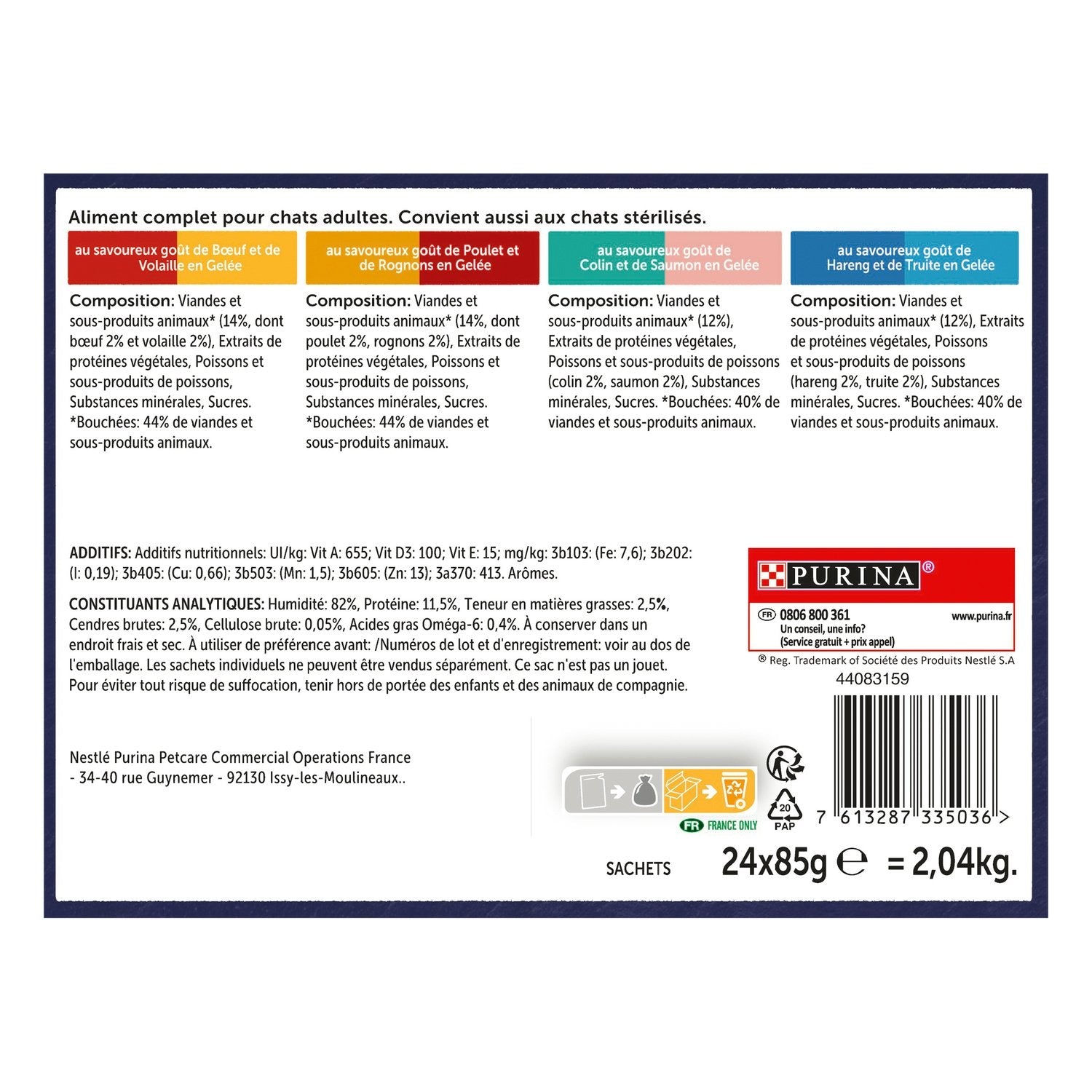 Zusammensetzung: Hering und Forelle: Fleisch und tierische Nebenprodukte* (12 %), pflanzliche Eiweißextrakte, FISCH und FISCHNebenprodukte (Hering 2 %, Forelle 2 %), Mineralstoffe, Zucker. *Happen: 40 % Fleisch und tierische Nebenprodukte. Seehecht und Lachs: Fleisch und tierische Nebenprodukte* (12 %), pflanzliche Eiweißextrakte, FISCH und FISCHNebenprodukte (Seehecht 2 %, Lachs 2 %), Mineralstoffe, Zucker. *Happen: 40 % Fleisch und tierische Nebenprodukte. Lamm und Huhn: Fleisch und tierische Nebenprodukte (einschließlich Lamm, Huhn), pflanzliche Eiweißextrakte, FISCH und FISCHNebenprodukte, Aminosäuren, Verdickungsmittel, Mineralstoffe, Zucker, Vitamine. Huhn und Nieren: Fleisch und tierische Nebenprodukte* (14 %, einschließlich Huhn 2 %, Nieren 2 %), pflanzliche Eiweißextrakte, FISCH und FISCHNebenprodukte, Mineralstoffe, Zucker. *Bites: 44 % Fleisch und tierische Nebenerzeugnisse.