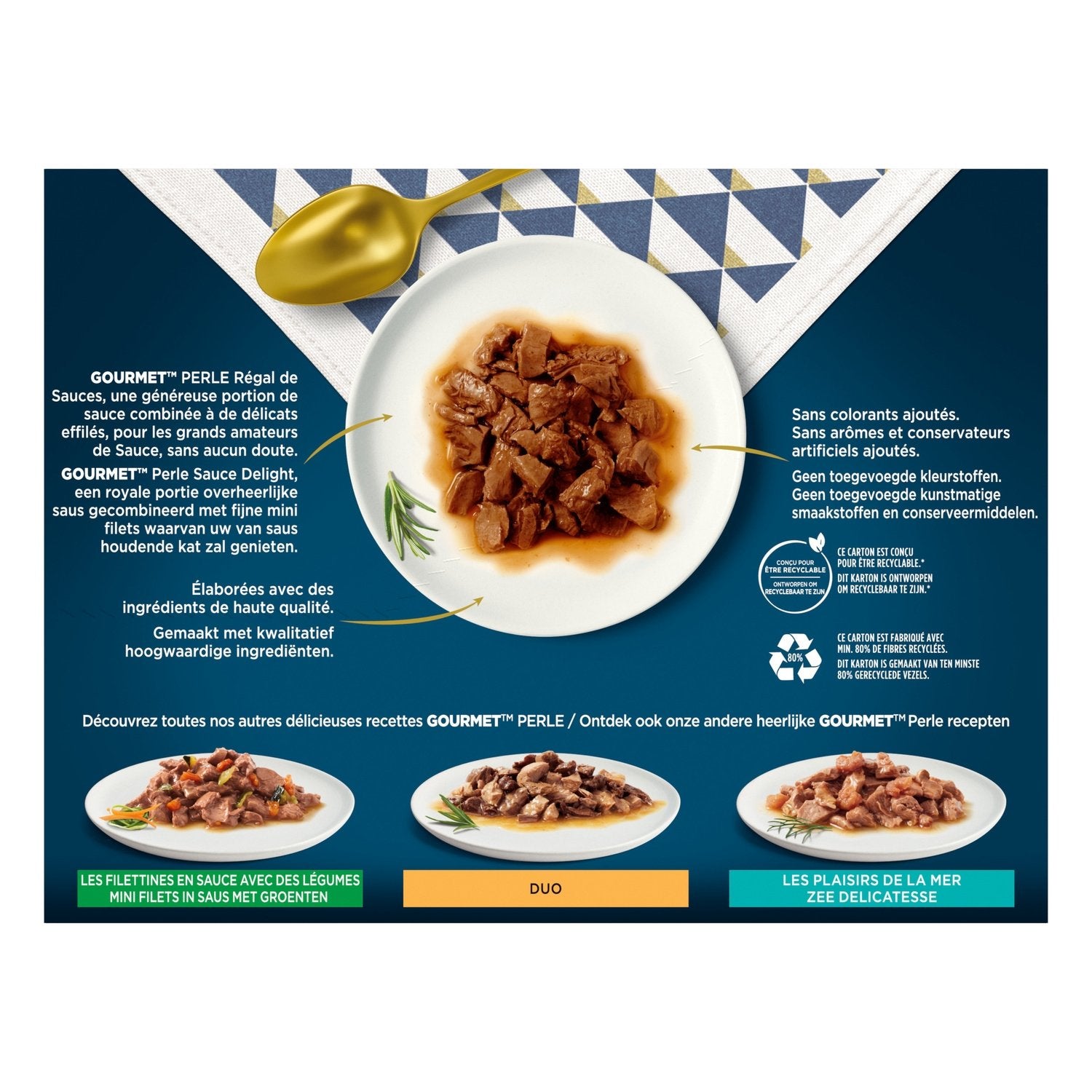 Alleinfuttermittel für ausgewachsene Katzen, GOURMET Perle Sauce Treat, eine großzügige Portion Sauce kombiniert mit zarten Schnitzeln, für große Saucenliebhaber, bis zum letzten Tropfen.,Ohne Zusatz künstlicher Aromen, ohne Zusatz künstlicher Konservierungsstoffe und ohne Zusatz künstlicher Farbstoffe.,Dieser Karton besteht aus mindestens 80 % recycelten Fasern.,Dieser Karton ist recycelbar.,Dieser Beutel ist recycelbar.,Hergestellt mit hochwertigen Zutaten