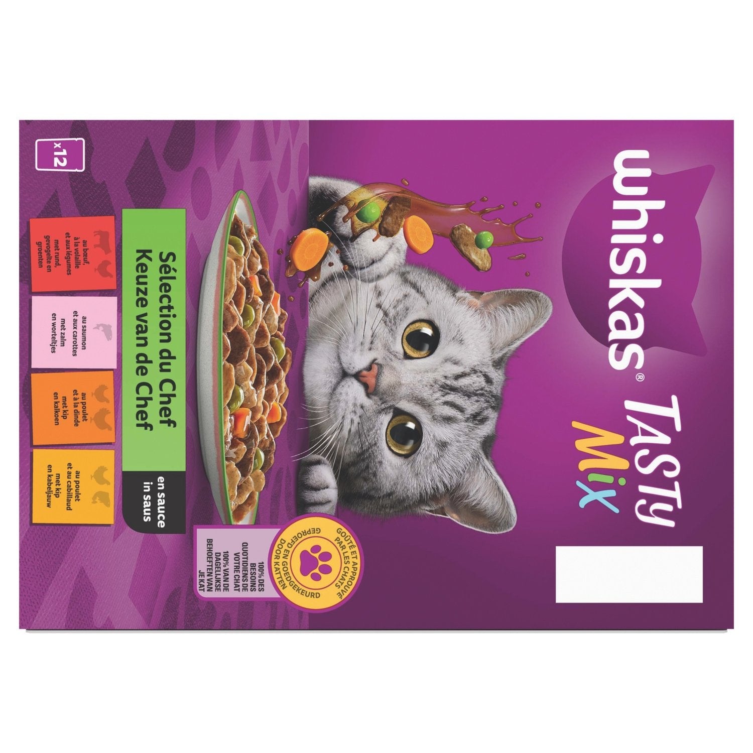 Alleinfuttermittel für ausgewachsene Katzen ab 1 Jahr – Auch für kastrierte Katzen geeignet – Whiskas® Tasty Mix Chef's Selection Frischebeutel in Sauce, 4 Sorten (mit Rind, Geflügel und Gemüse / Lachs und Karotten / Huhn und Pute / Huhn und Kabeljau). Köstliche Rezepte mit einer verführerischen Mischung aus Zutaten, die den Gaumen Ihrer Katze bei jeder Mahlzeit verwöhnen, ohne Kompromisse bei der Ernährung einzugehen. Von Katzen probiert und für gut befunden, macht jedes leckere Gericht in Sauce Appetit und sorgt für ein Wohlgefühl, das Ihre Katze vor Freude schnurren lässt! Zubereitet mit hochwertigen Zutaten, einer zarten Textur und einem unwiderstehlichen Geschmack für garantierten Genuss! Der in unseren Rezepturen verwendete Fisch stammt aus nachhaltigen Quellen. Geben Sie Ihrer Katze die Aromen, die sie bevorzugt, und all die guten Dinge, die sie für Abwechslung braucht, und helfen Sie ihr gleichzeitig, vital und glücklich zu bleiben. Eine vollwertige und ausgewogene Mahlzeit…