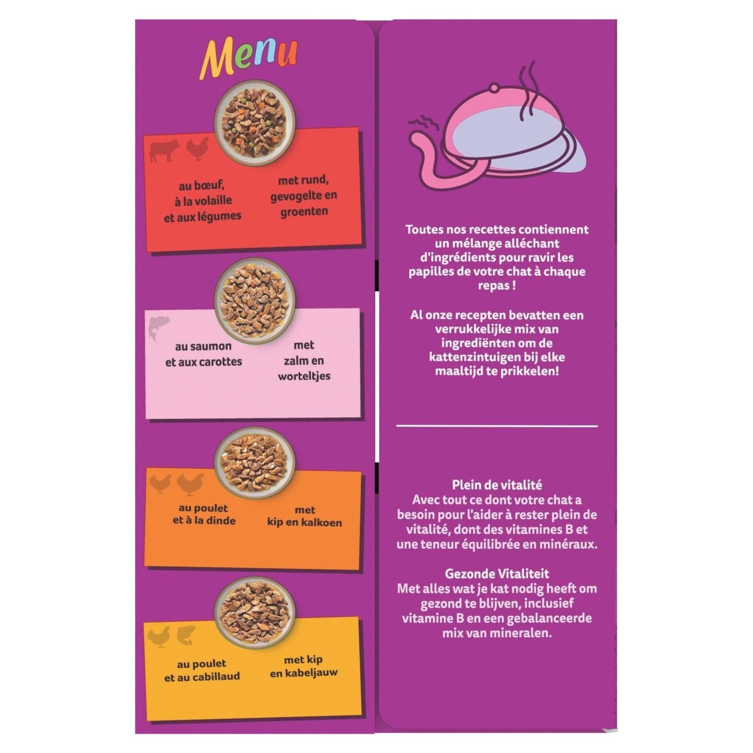mit Rindfleisch, Geflügel und Gemüse: Fleisch und tierische Nebenerzeugnisse (34 %, davon 4 % Rindfleisch und 4 % Geflügel in den Bites*), Getreide, Gemüse (darunter 1 % einer Mischung aus getrockneten Erbsen und Karotten (entspricht 4 % einer Mischung aus Erbsen und Karotten), Nebenerzeugnisse pflanzlichen Ursprungs, Mineralstoffe, pflanzliche Eiweißextrakte, Zucker. *Die Bites machen ca. 40 % des Gesamtprodukts aus. mit Lachs und Karotten: Fleisch und tierische Nebenerzeugnisse (32 %), FISCH und FISCHNebenerzeugnisse (darunter 4 % Lachs in den Bites*), Getreide, Nebenerzeugnisse pflanzlichen Ursprungs, Gemüse (darunter 0,6 % getrocknete Karotten (entspricht 4 % Karotten), Mineralstoffe, pflanzliche Eiweißextrakte, Zucker. *Die Bites machen ca. 40 % des Gesamtprodukts aus. mit Huhn und Pute: Fleisch und tierische Nebenerzeugnisse (34%, davon 4% Huhn und 4% Pute in den Bites*), Getreide, Nebenerzeugnisse pflanzlichen Ursprungs, Mineralstoffe, Extrakte aus…