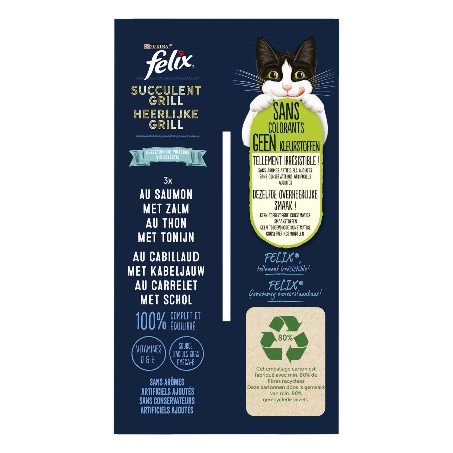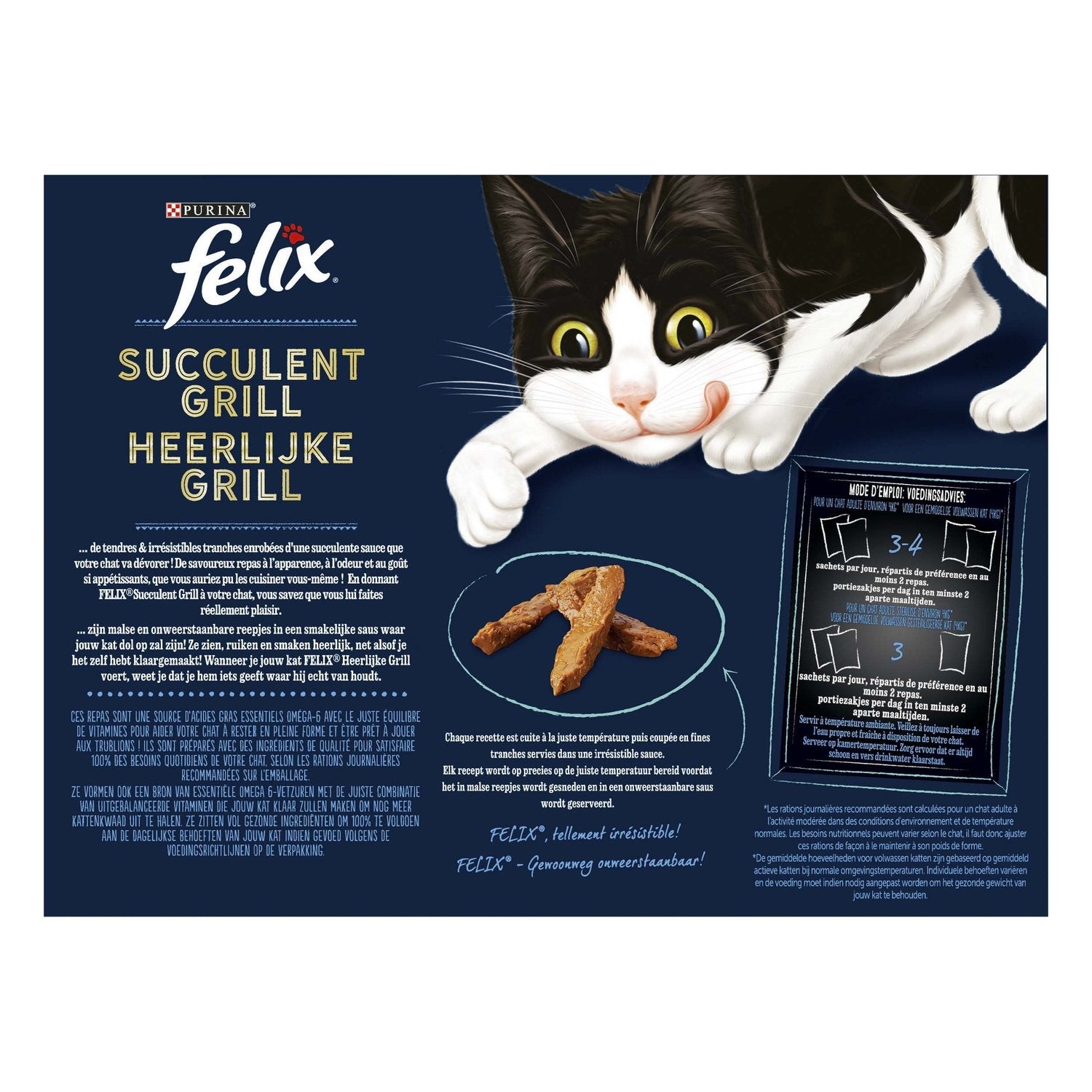 FELIX Succulent Grill, zarte und unwiderstehliche Scheiben, umhüllt von einer saftigen Sauce, die Ihre Katze verschlingen wird! Leckere Mahlzeiten, die so appetitlich aussehen, riechen und schmecken, als hätten Sie sie selbst zubereitet! Jedes Rezept wird auf die perfekte Temperatur gegart und dann in dünne Scheiben geschnitten und in einer unwiderstehlichen Sauce serviert. Wenn Sie Ihrer Katze FELIX Succulent Grill geben, wissen Sie, dass Sie ihr wirklich etwas Gutes tun. Diese Mahlzeiten sind eine Quelle für essentielle Omega-6-Fettsäuren mit der richtigen Vitaminbalance, damit Ihre Katze in Topform bleibt und bereit ist, den Unruhestifter zu spielen! Sie werden mit hochwertigen Zutaten zubereitet, um den Tagesbedarf Ihrer Katze gemäß der auf der Verpackung empfohlenen Tagesmenge zu 100 % zu decken. Und das ist noch nicht alles! FELIX Succulent Grill ist in einer Reihe köstlicher Rezepte erhältlich, um den Appetit Ihrer Katze auf Abwechslung jeden Tag zu stillen. FELIX, so unwiderstehlich!