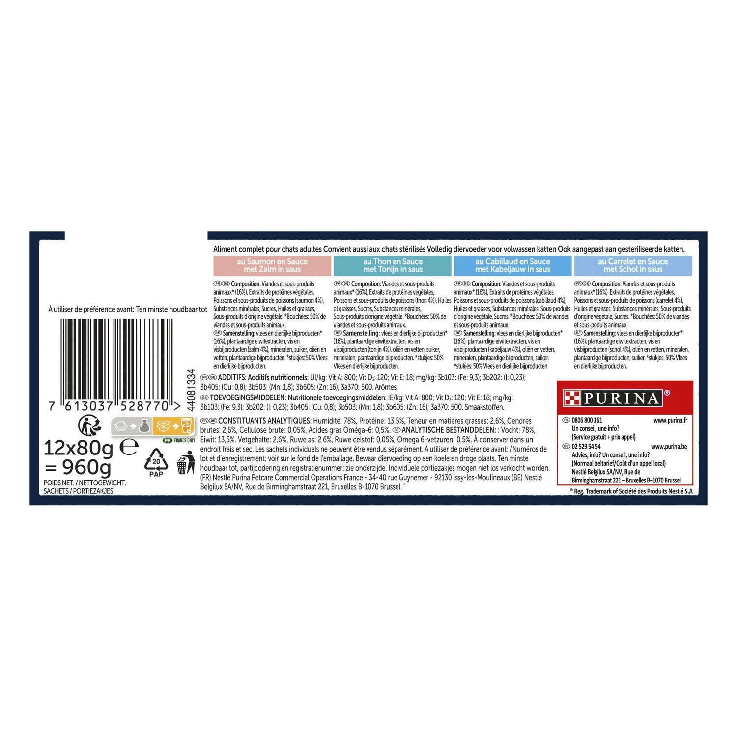Zusammensetzung: Fleisch und tierische Nebenerzeugnisse* (16%), pflanzliche Eiweißextrakte, FISCH und FISCHNebenerzeugnisse (Thunfisch/ oder Lachs/ oder Scholle/ oder Kabeljau 4%), Mineralstoffe, Zucker, Öle und Fette, Nebenerzeugnisse pflanzlichen Ursprungs. *Happen: 50% Fleisch und tierische Nebenerzeugnisse.