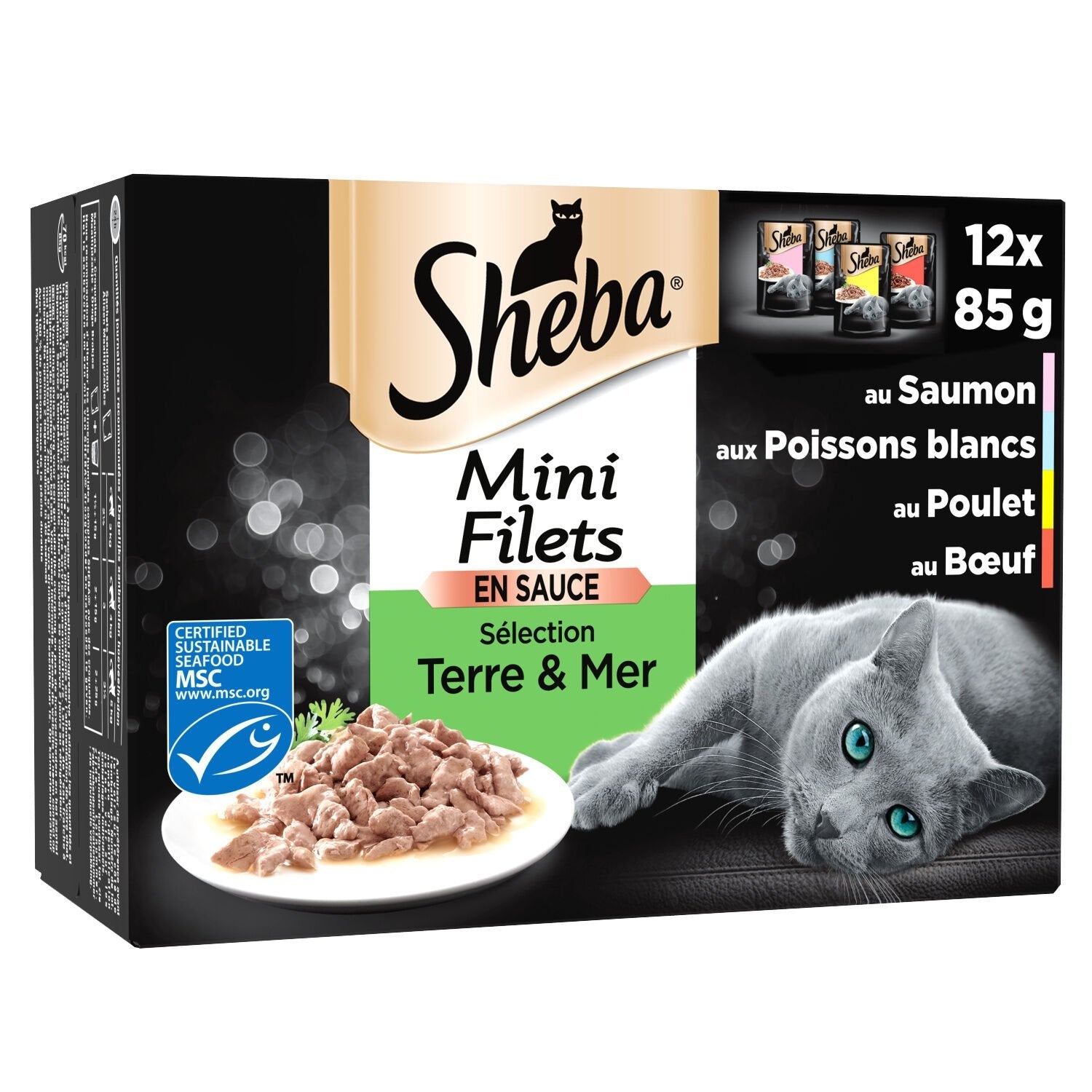 Sheba® Mini Fillets Selection Land & Sea Frischebeutel für erwachsene Katzen sind im Format 12 x 85 g erhältlich.