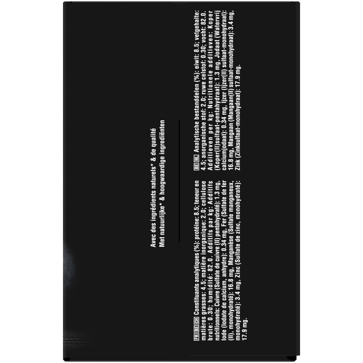 Mit Weißfisch: Fleisch und tierische Nebenprodukte (40 %, davon 94 % natürlich*), Fisch und Fischnebenerzeugnisse (100 % natürlich*, davon Weißfisch 4 %), Getreide, Mineralstoffe, Zucker.