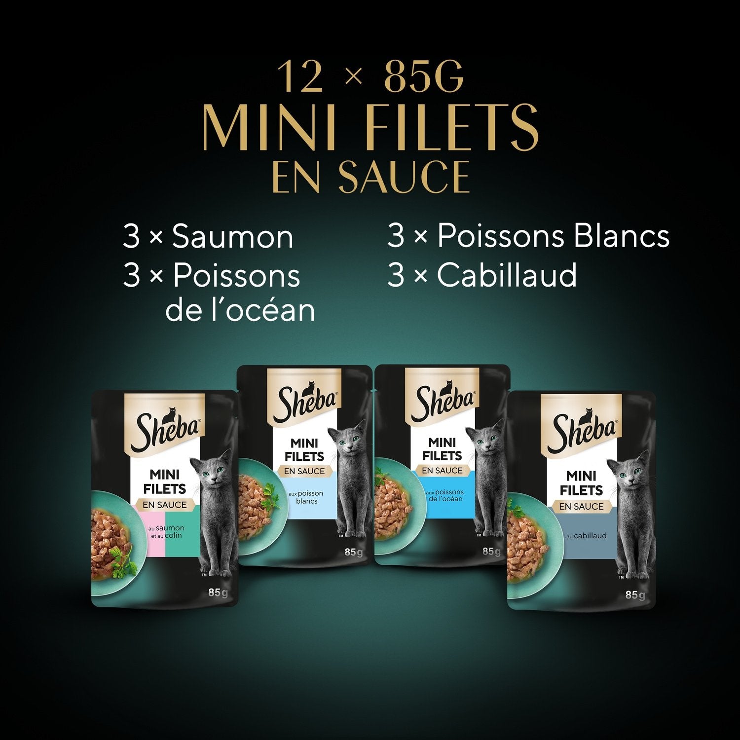 Sheba® Mini Fillets Selection Fish Freshness Pouches für erwachsene Katzen sind im Format 12 x 85 g erhältlich.