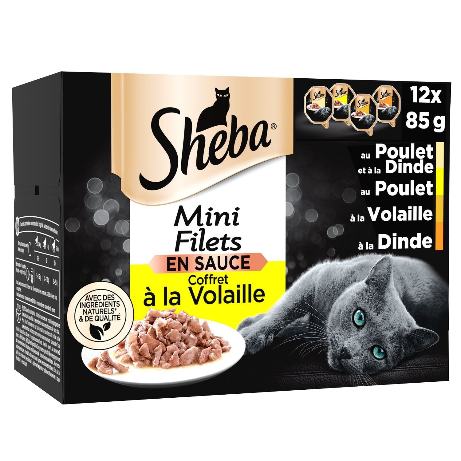 Sheba® Mini Fillets Poultry Box-Futterschalen für ausgewachsene Katzen sind im Format 12 x 85 g erhältlich.