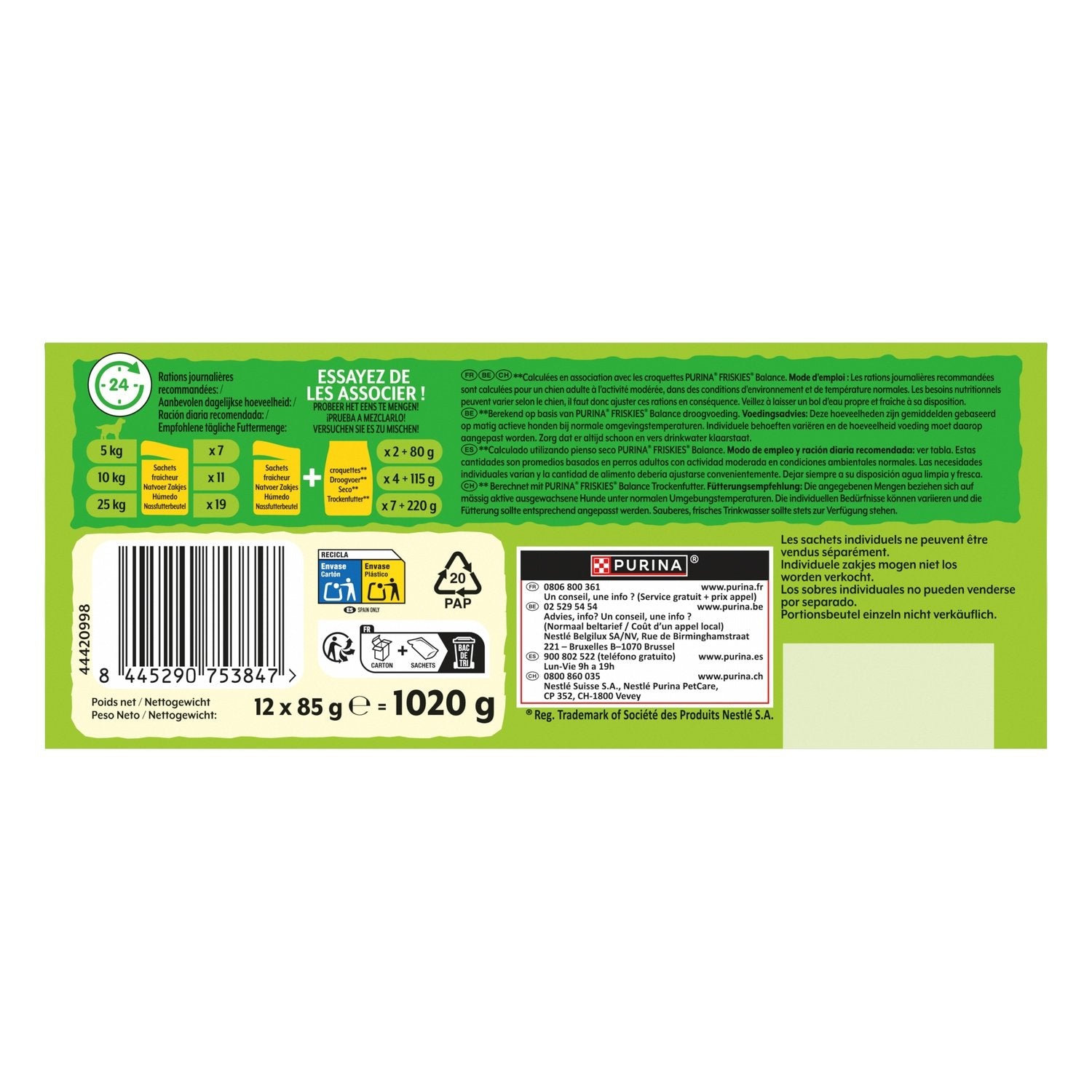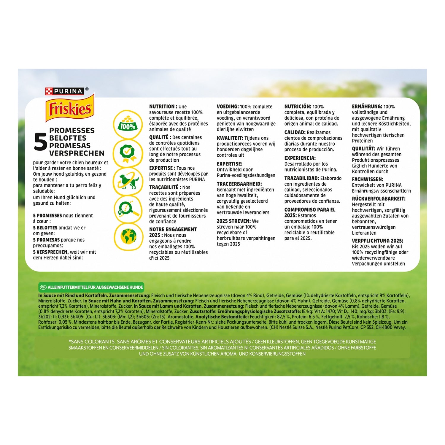 Die 5 FRISKIES-Versprechen. Von dem Tag an, an dem Sie Ihren Hund bei sich willkommen hießen, sind Sie eine Verpflichtung eingegangen. Sie haben versprochen, sich um ihn zu kümmern, ihn gut zu ernähren und ihm zu helfen, ein glückliches und gesundes Leben voller Vitalität zu führen – für mehr Glück in Ihrem Zuhause. Mit über 50 Jahren Erfahrung füttert FRISKIES seit Generationen glückliche und gesunde Hunde mit leckerem, hochwertigem Futter. Das ist eine große Verantwortung. Genau wie Sie halten wir bei FRISKIES unsere Versprechen. Für Ihren Hund und für Sie. 5 Versprechen, die uns am Herzen liegen: - Ernährung: Eine leckere Rezeptur, die zu 100 % vollständig und ausgewogen ist und aus hochwertigen tierischen Proteinen hergestellt wird. - Qualität: Während unseres gesamten Produktionsprozesses werden täglich Hunderte von Kontrollen durchgeführt. - Fachwissen: Alle unsere Produkte werden von PURINA-Ernährungswissenschaftlern entwickelt. - Rückverfolgbarkeit: Unsere Rezepte werden mit hochwertigen Zutaten zubereitet, die sorgfältig von vertrauenswürdigen Lieferanten ausgewählt wurden. - Unsere Verpflichtung für 2025: Wir verpflichten uns, unsere Verpackungen bis 2025 zu 100 % recycelbar oder wiederverwendbar zu machen. Alle Rezepte sind frei von zugesetzten künstlichen Farb-, Geschmacks- und Konservierungsstoffen.