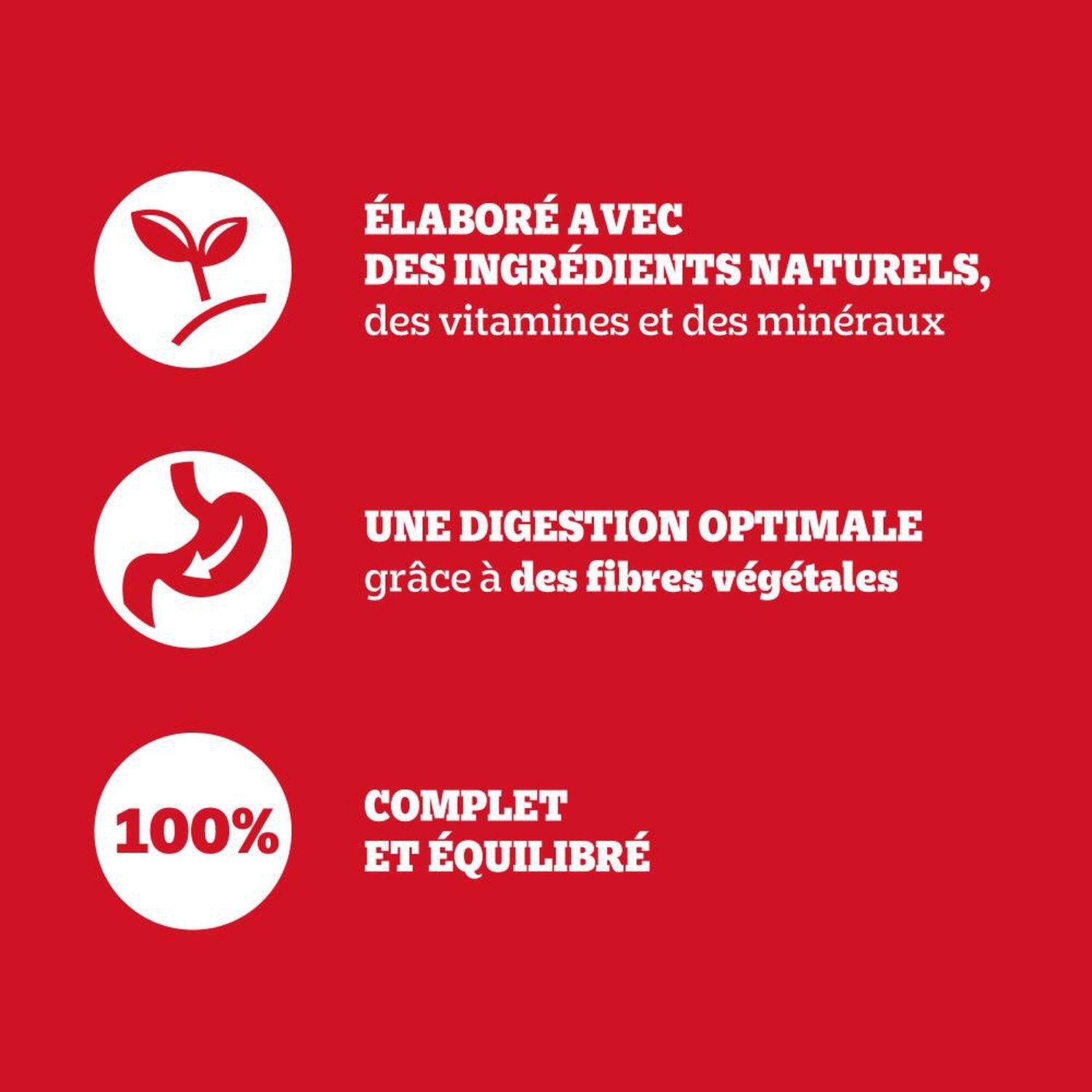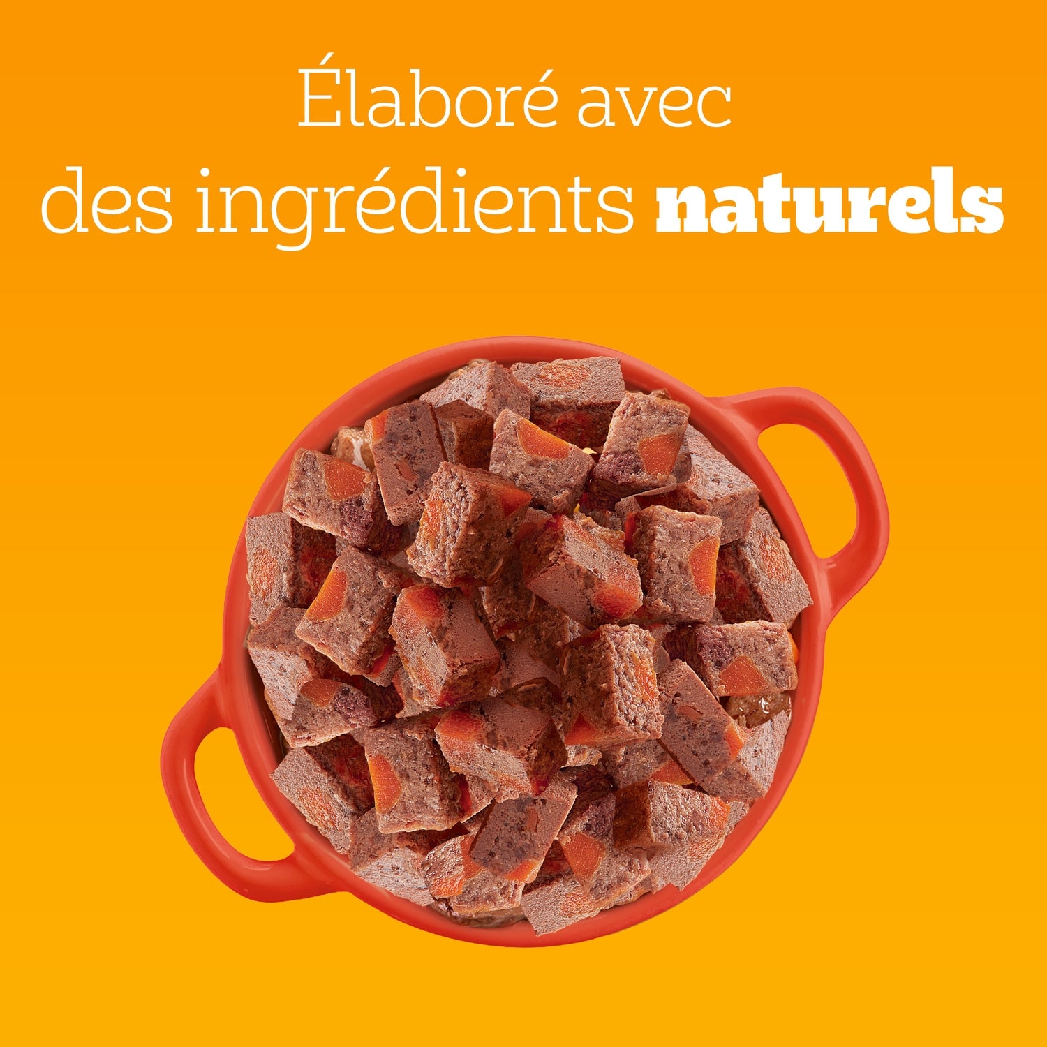 Zusammensetzung: Mit einer Mischung aus Rindfleisch, Leber und Karotten: Fleisch und tierische Nebenerzeugnisse* (einschließlich einer Mischung aus Rindfleisch 2 % und Schweineleber 4 %), Getreide, Gemüse (einschließlich Karotten 4 %), Mineralstoffe, Nebenerzeugnisse pflanzlichen Ursprungs (einschließlich getrockneter Rübenschnitzel 0,5 %). *95 % natürlich.
