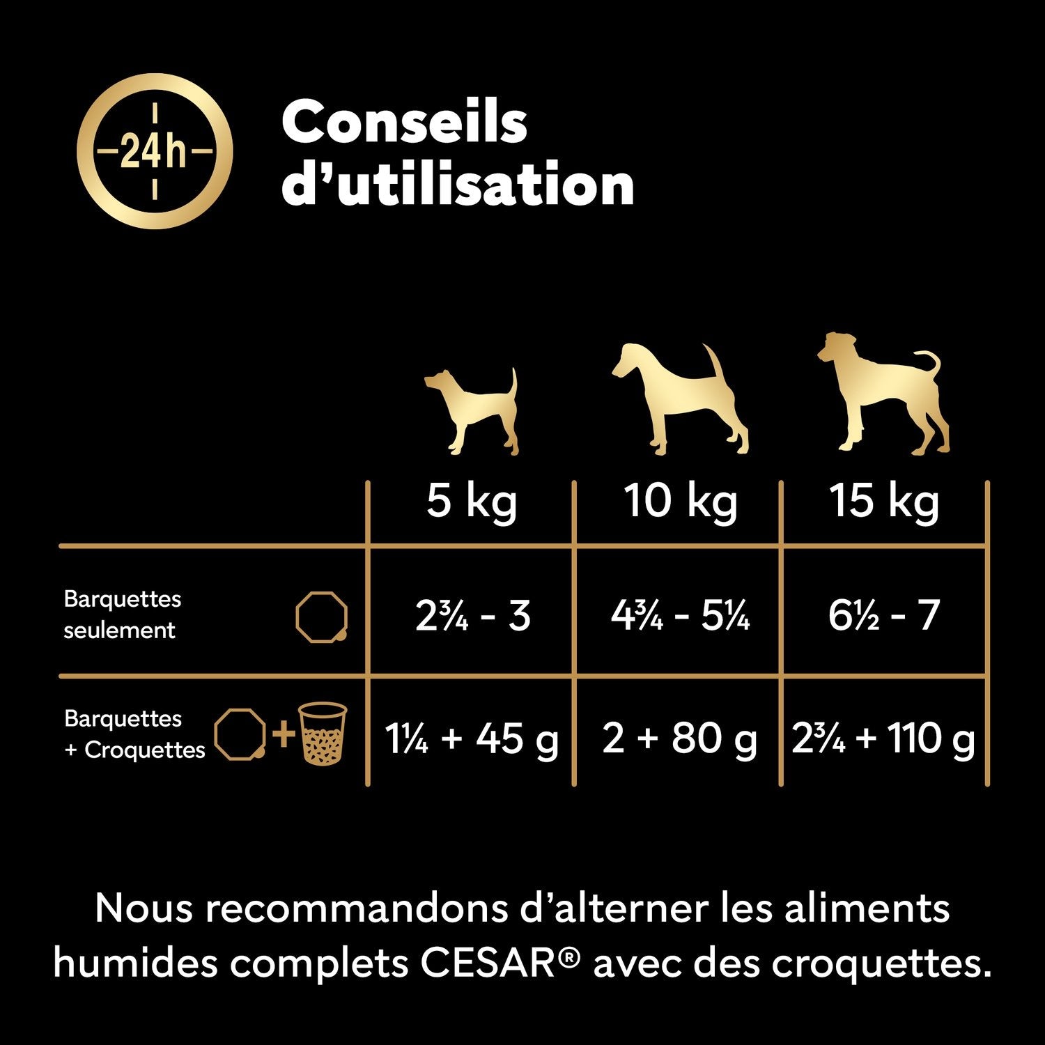Alleinfuttermittel für ausgewachsene Hunde – 4 Sorten in Terrine (Huhn und Gemüse / Rind und Gemüse / Geflügel und gemischtes Gemüse und Reis / Pute und gemischtes Gemüse und Reis). Leckere Hundeschalen mit feinen, hochwertigen Häppchen, zubereitet mit natürlichen Zutaten*, die sorgfältig für den empfindlichen Gaumen Ihres Hundes ausgewählt wurden (*nur in bestimmten Rezepturen). 100 % vollwertig und ausgewogen: Die Cesar®-Schalen Les terrines** du jardin au coeur de légumes sind gesunde und leckere Mahlzeiten, die Ihren Hund jeden Tag erfreuen. Cesar® weiß, was Ihr kleiner Hund braucht. Eine einfache und großzügige Rezeptur, ohne Zuckerzusatz oder künstliche Aromen. 100 % recycelbare Kartonverpackung. Die Anweisungen können lokal variieren. Erkundigen Sie sich bei Ihrer örtlichen Behörde nach den Recyclingmöglichkeiten von Aluminiumschalen.