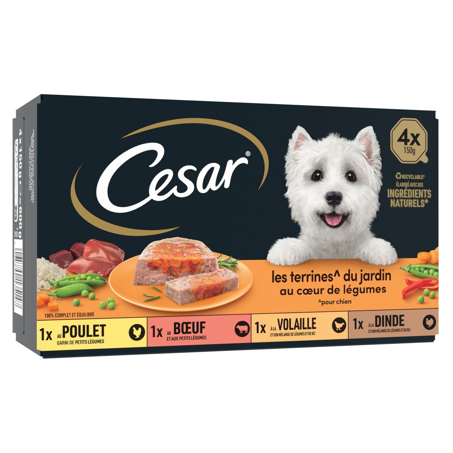 Cesar® Garden Terrines Hundefutterschalen sind im 4x150g-Format erhältlich.