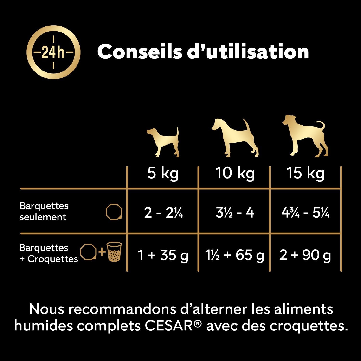 Alleinfuttermittel für Senioren ab 10 Jahren – 4 Sorten in Gelee (mit zartem Hähnchen und Reis / mit saftigem Rindfleisch und Gemüse / mit zartem Lamm und Erbsen / mit leckerem Truthahn und Reis). Cesar® Senior-Schalen bieten leckere Rezepte, die Ihr Hund lieben wird, speziell entwickelt für seine Bedürfnisse und zur Förderung einer guten Verdauung. Cesar® Senior 10+ sind mit Liebe entwickelte Rezepte, 100 % vollwertige und ausgewogene, gesunde und leckere Mahlzeiten, die ihm jeden Tag Freude bereiten. Qualitätsrezepte, zubereitet mit sorgfältig ausgewählten Zutaten. Cesar® weiß, was Ihr kleiner Hund braucht. Eine einfache und großzügige Rezeptur, ohne Zuckerzusatz, ohne künstliche Aromen. 100 % recycelbare Kartonverpackung. Die Anweisungen können lokal variieren. Erkundigen Sie sich bei Ihrer örtlichen Behörde nach dem Recycling von Aluminiumschalen.