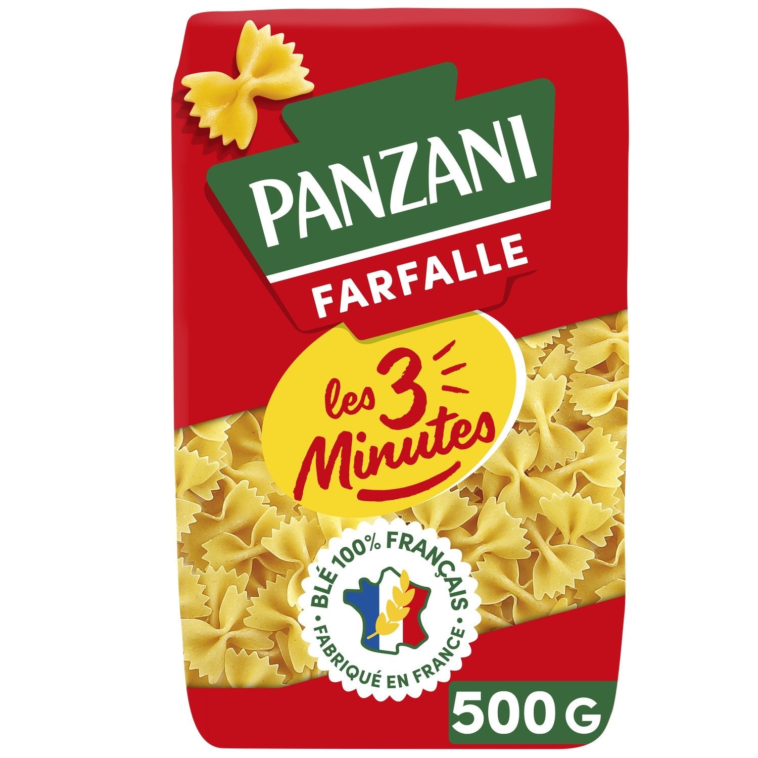 Unsere Panzani 3-Minuten-Farfalle bieten den ganzen Genuss und die Qualität von Panzani-Nudeln aus 100 % französischem Weizen und sind dank eines dünneren Teigs, der ein schnelleres Garen ermöglicht, in nur 3 Minuten fertig. Sie werden mit viel Liebe in unseren Nudelfabriken in Marseille und Nanterre hergestellt.