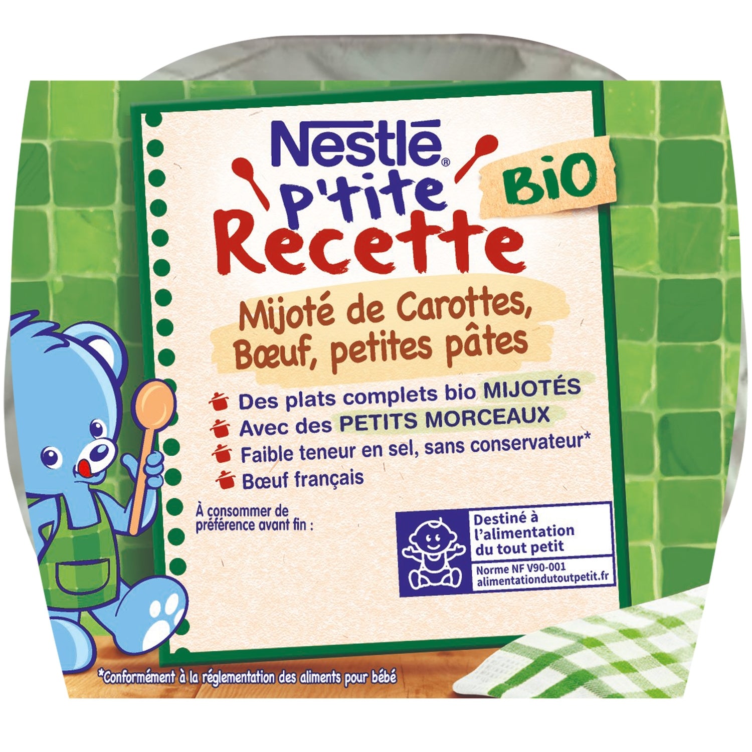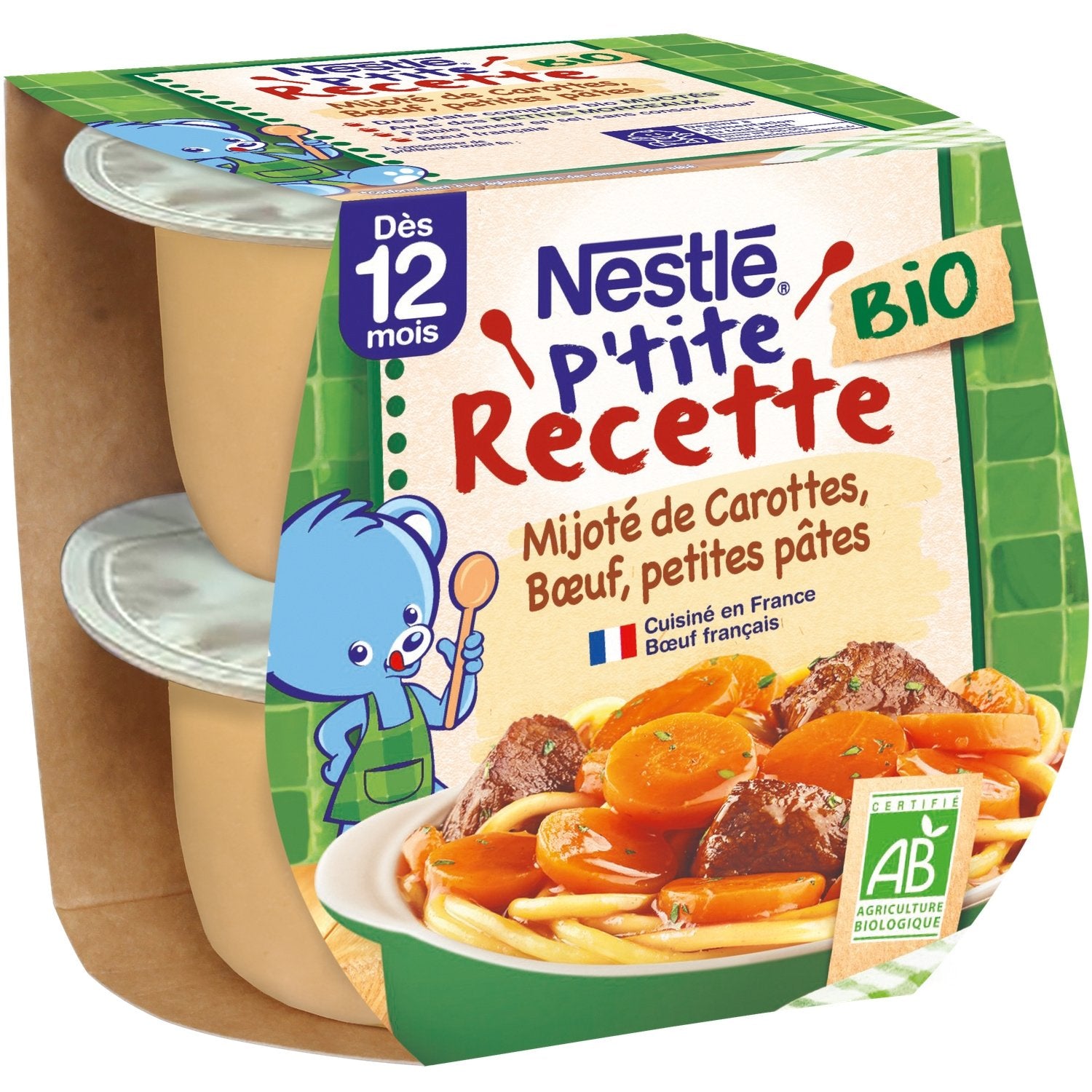 Entdecken Sie unser kleines Bio-Babygericht P'tite Recette BIO: Karotteneintopf, Rindfleisch, kleine Nudeln: ein großer Klassiker der französischen Küche, inspiriert von einer Variation von Boeuf Bourguignon. Ein köstliches Bio-Babygericht für Babys ab 12 Monaten* mit kleinen Stücken, um die Entdeckung verschiedener Texturen fortzusetzen. Ein in Frankreich gekochtes Rezept mit französischem Rindfleisch und Karotten, geköchelt mit Thymian und Lorbeerblatt, um das Baby für neue Aromen zu begeistern. Zutaten aus biologischem Anbau, der zum Schutz der Umwelt und der Artenvielfalt beiträgt**. Karotten und Nudeln aus der EU.