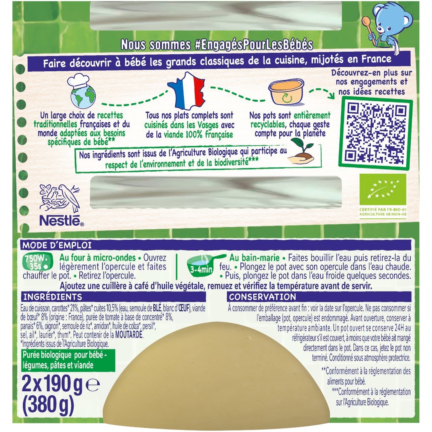 Ein komplettes Abendessen für Babys ab 12 Monaten mit kleinen Stücken. In Frankreich zubereitet., Niedriger Salzgehalt. Keine Konservierungsstoffe*., Zutaten aus biologischem Anbau, die zum Schutz der Umwelt und der Artenvielfalt beitragen**., Französisches Fleisch., * Gemäß den Vorschriften für Babynahrung. * Gemäß den Vorschriften für biologischen Landbau.