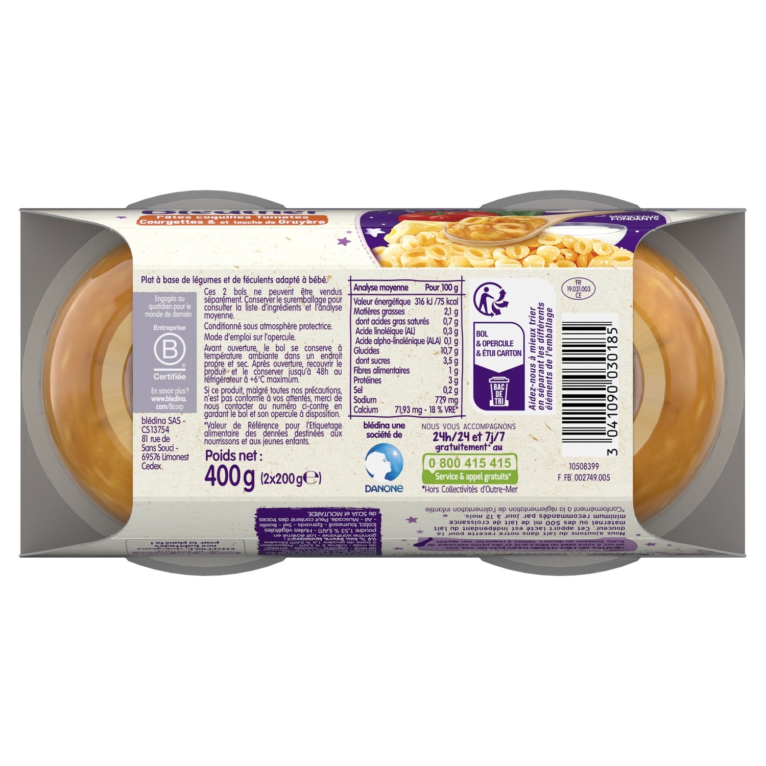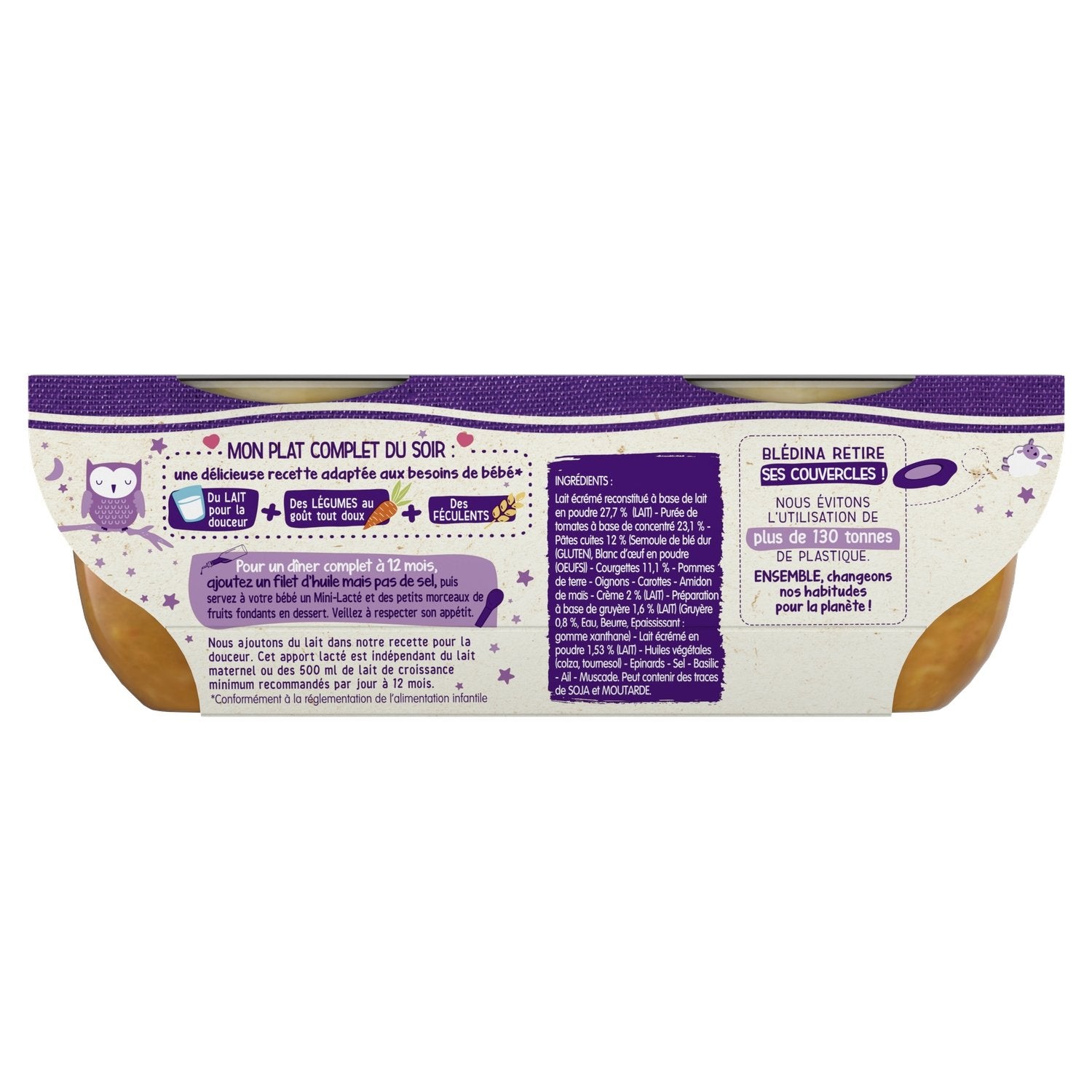 Damit jeder Abend zu einer schönen Geschichte wird, führen Sie Ihr Baby an die süßen Noten von Gemüse heran, indem Sie ihm Blédiner-Gemüseschalen anbieten.,Mein komplettes Abendessen: GEMÜSE mit sehr mildem Geschmack + MILCH zum Süßen + STÄRKE. Die zum Süßen hinzugefügte Milch ist unabhängig von den empfohlenen 500 ml Blédilait-Zuwachs pro Tag.,Niedriger Salzgehalt. Keine Pestizidrückstände (Gehalt unter 0,000001 % gemäß Säuglingsnahrungsverordnung.)