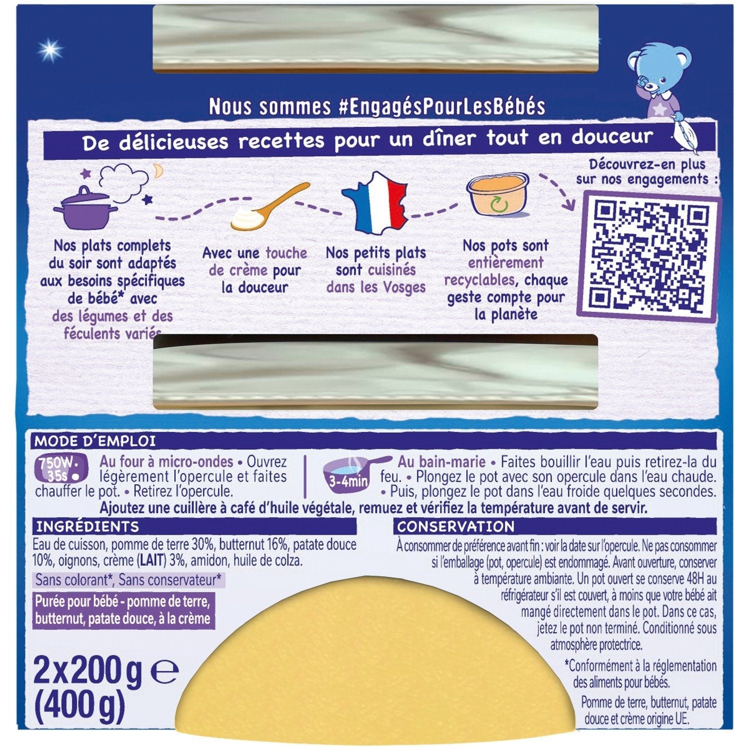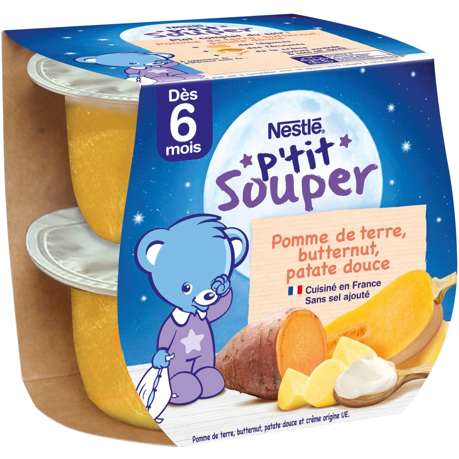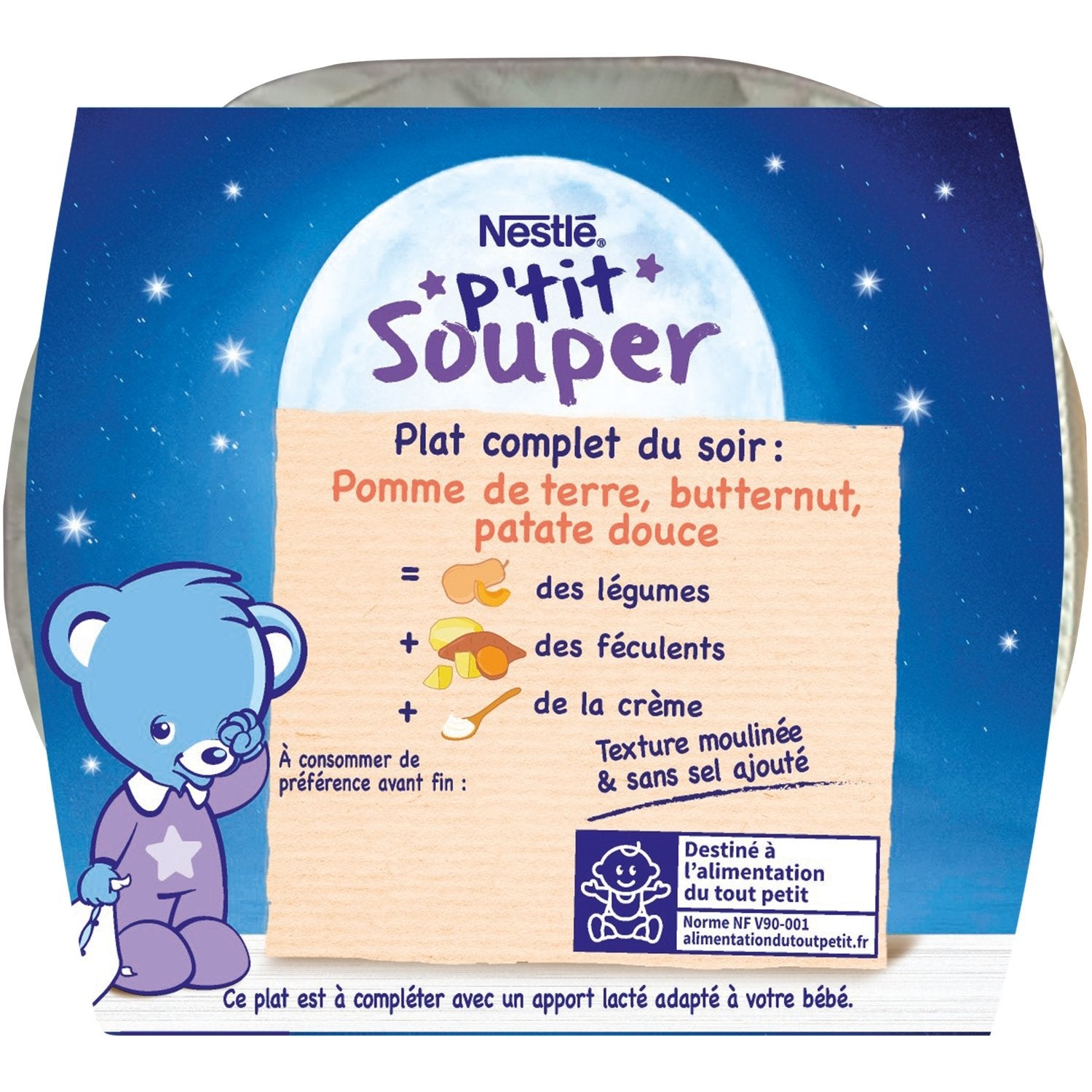 NEU! Vor dem Schlafengehen gibt es nichts Besseres als ein vollwertiges Abendessen. Entdecken Sie P'TIT SOUPER Kartoffeln, Butternusskürbis, Süßkartoffel: ein Babybrei-Gläschen für Babys ab 6 Monaten, mit Gemüse, stärkehaltigen Lebensmitteln und einem Hauch Sahne für die Süße. Ein in Frankreich zubereitetes Baby-Abendessen mit pürierter Konsistenz, ohne Salzzusatz, speziell für Babys geeignet! Kartoffeln, Butternusskürbis, Süßkartoffel und Sahne aus der EU.