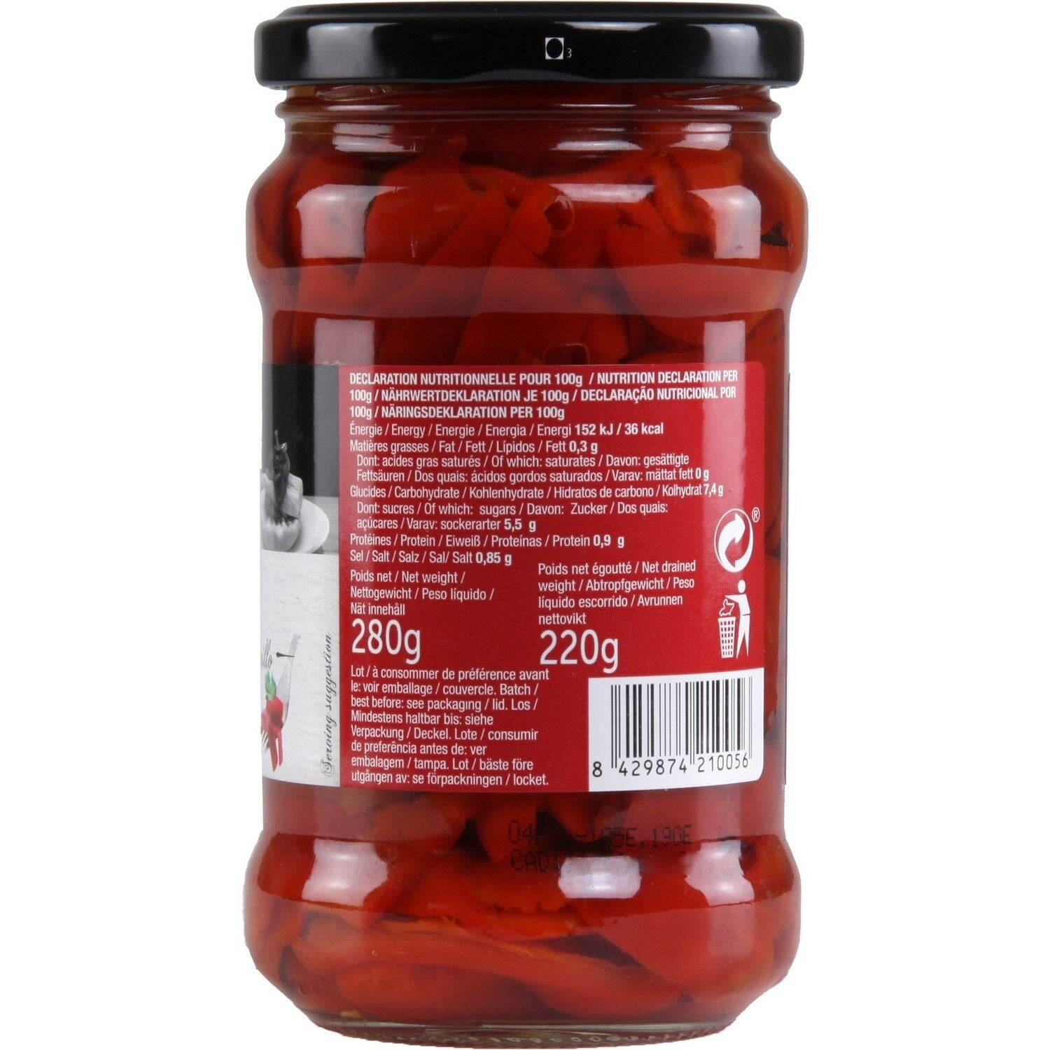 Paprika der Sorte „Piquillo“, Wasser, Salz, Zucker, Säuerungsmittel (Zitronensäure). Erste Kategorie.