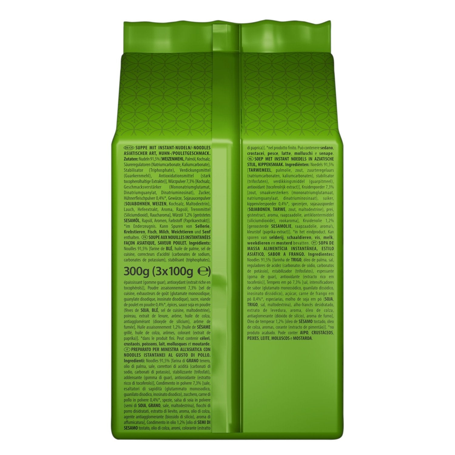 Nudeln 91,5% WEIZENmehl, Palmöl, Kochsalz, Säureregulatoren (Natriumcarbonate, Kaliumcarbonate), Stabilisator (Triphosphate), Verdickungsmittel (Guarkernmehl), Antioxidationsmittel (stark tocopherolhaltige Extrakte), Würzpulver 7,3% Kochsalz, Geschmacksverstärker (Mononatriumglutamat, Dinatriumguanylat, Dinatriuminosinat), Zucker, Hühnerfleischpulver 0,4%*, Gewürze, SOJAsaucenpulver (SOJAbohnen, WEIZEN, Kochsalz, Maltodextrin), Lauch, Hefeextrakt, Aroma, Rapsöl, Trennmittel (Siliciumdioxid), Raucharoma, Würzöl 1,2% geröstetes SESAMöl, Rapsöl, Aromen, Farbstoff (Paprikaextrakt). *im fertigen Produkt. Kann Spuren von SELLERIE, Krebstieren, FISCH, MILCH, Weichtieren und SENF enthalten.