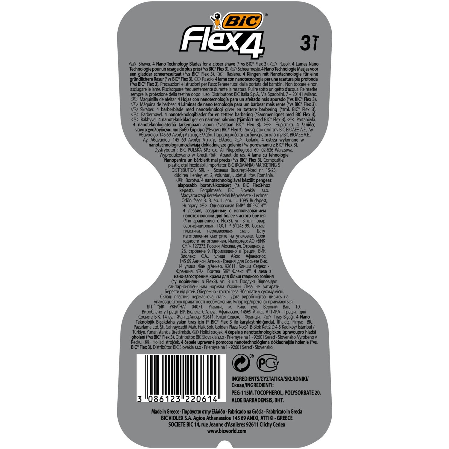 Wenn Sie einen leistungsstarken Herrenrasierer suchen, der sowohl ultrasanft als auch präzise rasiert, wird Sie der manuelle Rasierer BIC Flex4 mit vier Nanotechnologie-Klingen begeistern. Jede der vier beweglichen Klingen passt sich individuell jeder Rundung und Kontur Ihres Gesichts an: Selbst Ihr Dreitagebart hat keine Chance, ihm zu widerstehen! Dieser Rasierer bietet nicht nur eine noch gründlichere Rasur als der BIC Flex3-Rasierer, er lässt sich auch leicht abspülen, sodass er immer sauber und scharf bleibt. Sein schwenkbarer Kopf verfügt über einen breiten Schutzstreifen, der die Haut strafft, bevor die Klinge das Haar erreicht, und so für eine sehr präzise Rasur sorgt. Ihre Haut wird auch das perfekte Gleiten des mit Vitamin E und Aloe Vera angereicherten Gleitstreifens zu schätzen wissen. Sein gebogener, langer und dichter Griff hat einen widerstandsfähigen Gummigriff, der Kontrolle und Komfort während der Rasur bietet. Lassen Sie sich von seiner Sanftheit und Präzision überraschen. Bei BIC ist Qualität immer garantiert: Jeder Rasierer wird in Europa in den hochmodernen Fabriken der Gruppe hergestellt und dort strengen Sichtprüfungen und mehr als 30 verschiedenen Qualitätskontrollen unterzogen. Mit über 40 Jahren Erfahrung in der Entwicklung und Herstellung von Herrenrasierern ist BIC ein Name, dem Männer vertrauen können. Hier im 3er-Blister erhältlich.