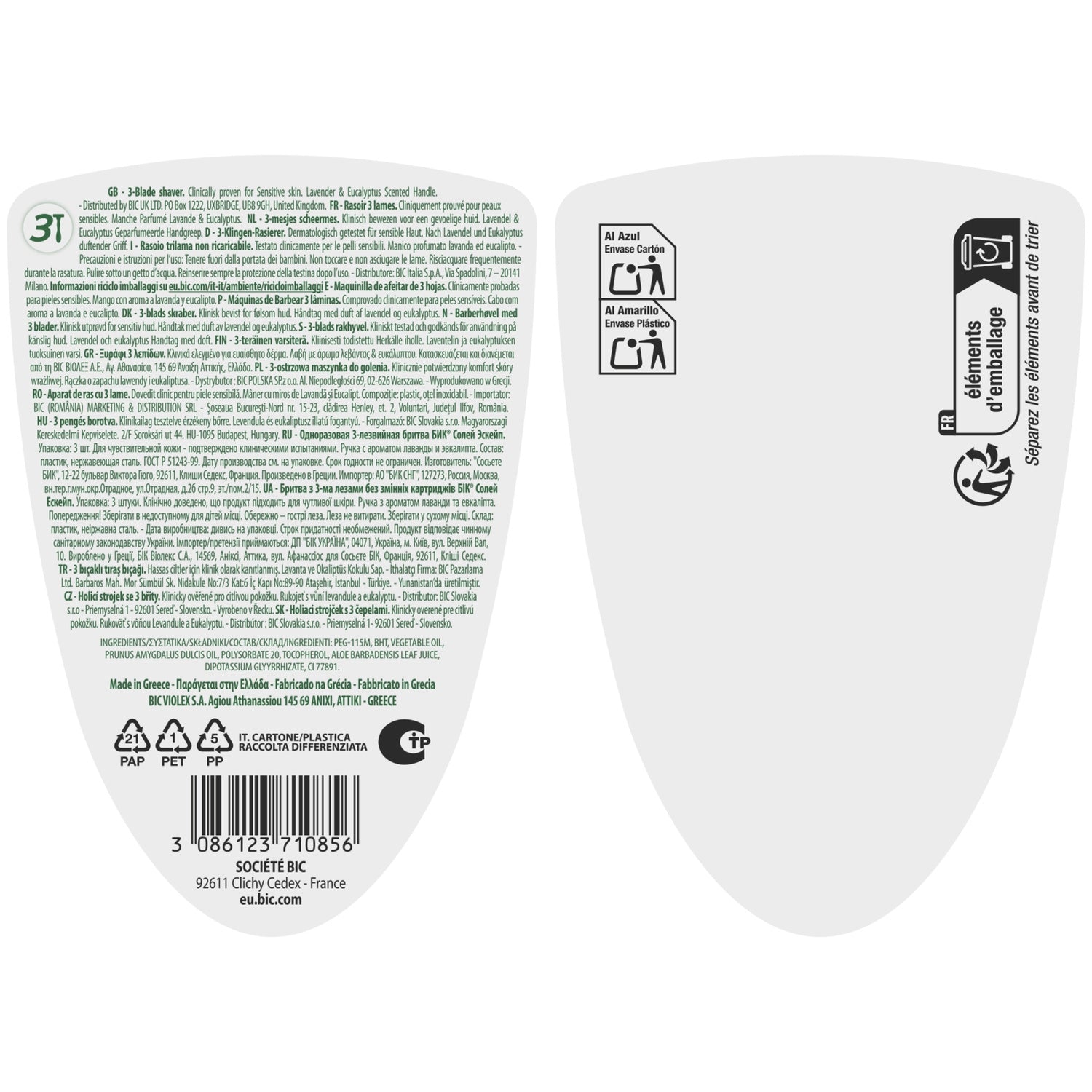 BIC Soleil Escape 3-Klingen-Lavendel- und Eukalyptus-Damenrasierer, 3er-Pack mit 3 langlebigen beweglichen Klingen und optimaler Gleitfähigkeit.,Genießen Sie ein besseres Rasiererlebnis dank des Griffs und des gebogenen Griffs dieses nach Lavendel und Eukalyptus duftenden Rasierers.,Mit seinem schwenkbaren Kopf, der allen Kurven Ihres Körpers folgt, ist der BIC Soleil Escape Rasierer klinisch für empfindliche Haut erprobt.,Der mit süßem Mandelöl angereicherte Gleitstreifen verbessert Ihr Erlebnis für eine sanfte und mühelose Rasur.,Wählen Sie je nach Wunsch und Stimmung zwischen zwei Grifffarben: Lavendelviolett und Eukalyptusgrün