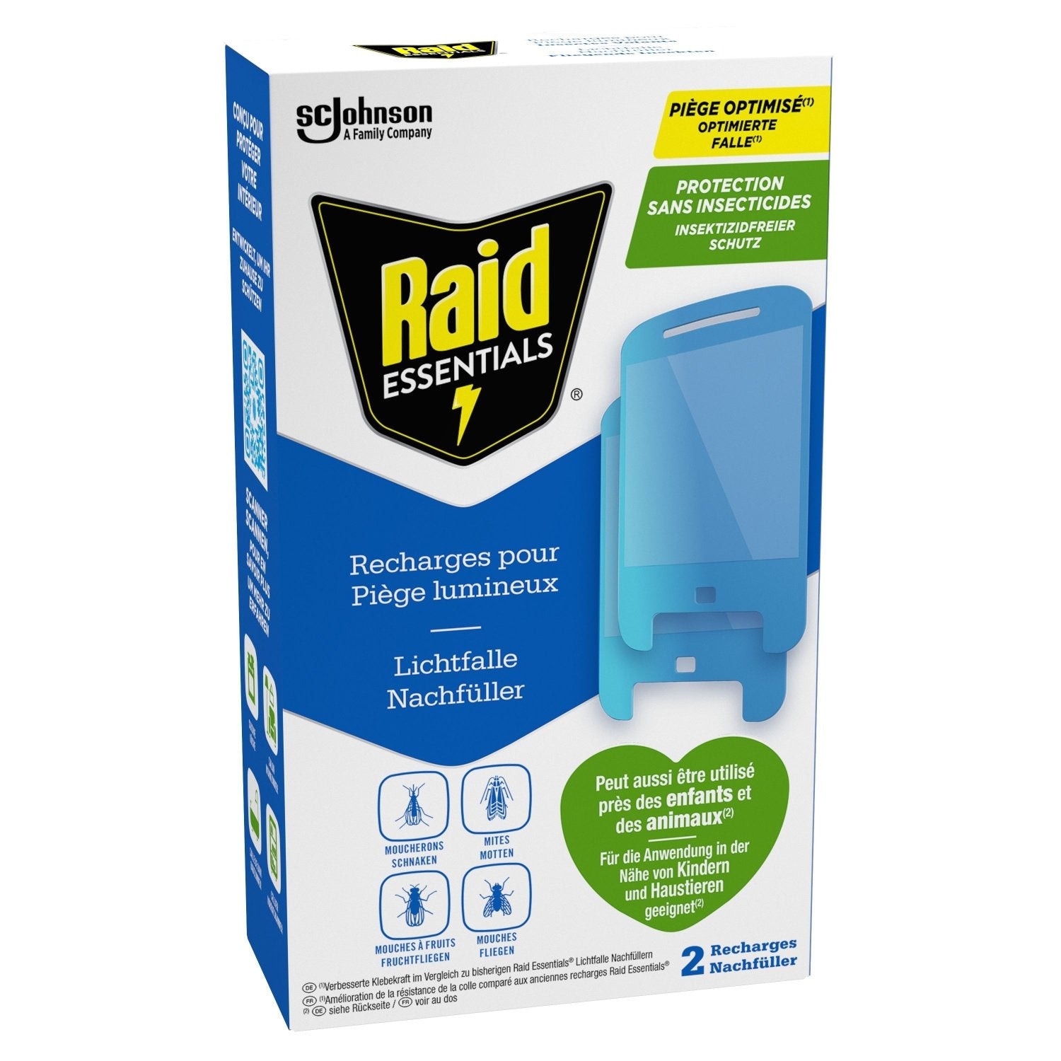 NEU: Die Raid Essentials® Lichtfalle schützt Sie jetzt dank verstärktem Klebstoff vor Fliegen! ,SCHUTZ GEGEN FLIEGENDE INSEKTEN: Die Lichtfalle lockt fliegende Insekten (Motten, Fruchtfliegen, Mücken und Fliegen) mit ihrem Licht an und fängt sie mit dem doppelseitigen Klebstoff. ,INSEKTIZIDFREI: Da die Falle keine Insektizide enthält, kann sie bei bestimmungsgemäßer Verwendung in der Nähe von Kindern, Tieren und Pflanzen verwendet werden. ,SCHÜTZT IHR ZUHAUSE: Die Falle wurde entwickelt, um Ihr Zuhause zu schützen: Küche, Wohnzimmer, Badezimmer, Garage, … ,GEBRAUCHSANWEISUNG: Für eine optimale Nutzung platzieren Sie die Lichtfalle so nah wie möglich an den Stellen, an denen Sie fliegende Insekten bemerkt haben (z. B. in der Küche neben Obstkörben oder in der Nähe von Pflanzen usw.). ,Inhalt: 2 Nachfüllpackungen