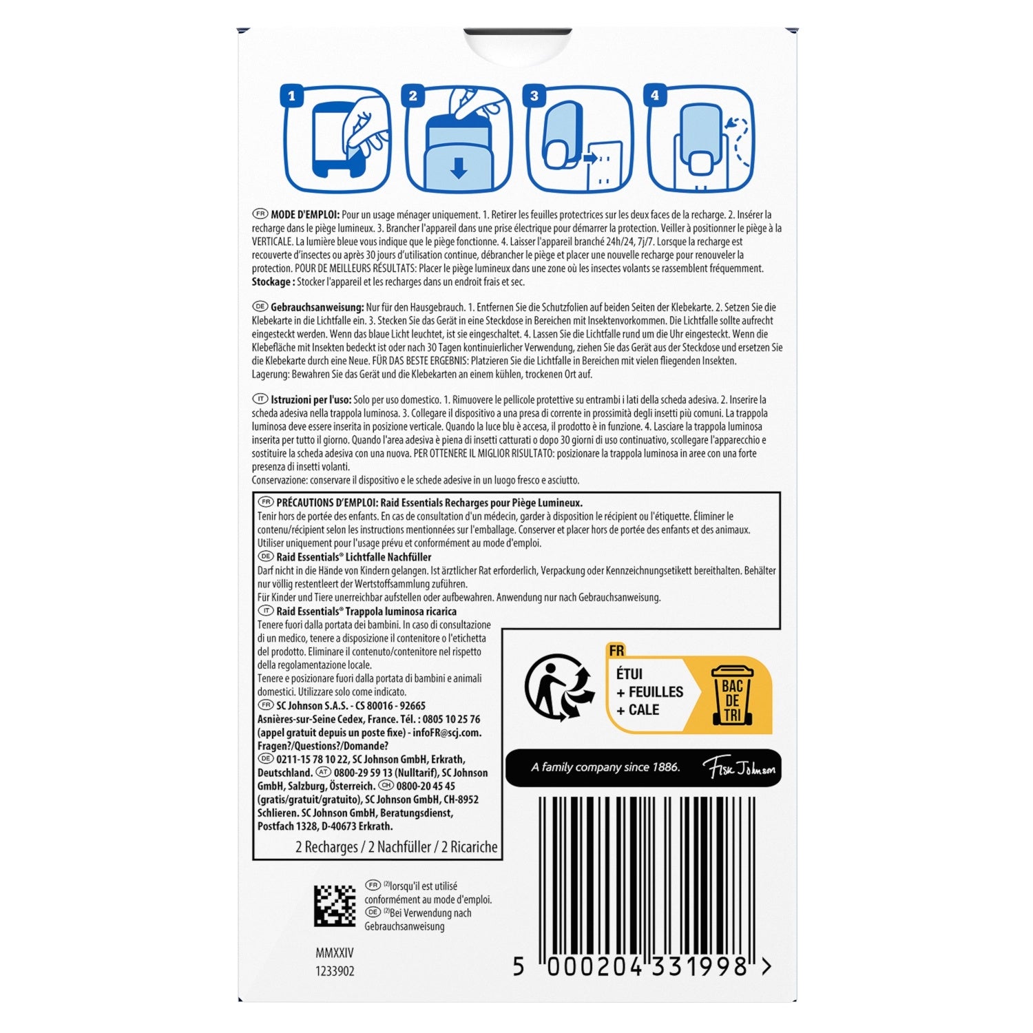 Die Raid Essentials® Lichtfalle schützt Sie vor kleinen fliegenden Insekten wie Motten, Fruchtfliegen und Stechmücken. Jetzt schützt sie Sie auch vor Fliegen dank ihres verstärkten Klebstoffs! Sie lockt fliegende Insekten (Motten, Fruchtfliegen, Stechmücken und Fliegen) mit ihrem Licht an und fängt sie mit dem doppelseitigen Klebstoff. Die insektizidfreie Falle kann bei bestimmungsgemäßer Verwendung in der Nähe von Kindern, Haustieren und Pflanzen verwendet werden. Sie wurde zum Schutz Ihres Zuhauses entwickelt: Küche, Wohnzimmer, Bad, Garage usw. Für eine optimale Nutzung platzieren Sie die Lichtfalle so nah wie möglich an den Stellen, an denen Sie fliegende Insekten bemerkt haben (z. B. in der Küche neben Obstkörben oder in der Nähe von Pflanzen usw.). Der Insektenfang kann nachts höher sein. Für beste Ergebnisse wird empfohlen, das Gerät von starken Lichtquellen fernzuhalten. Eine Packung enthält zwei Nachfüllpackungen.