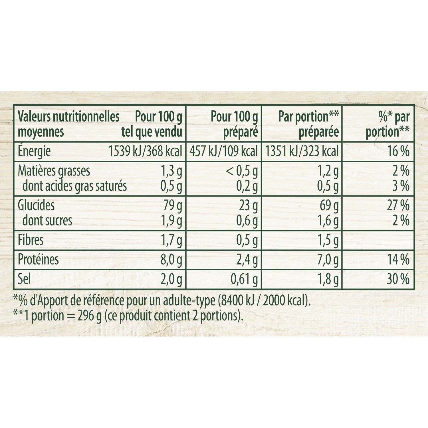 Brennwert (kJ): 1539 kJ / 100 g | Brennwert (kcal): 368 kcal / 100 g | Fett: 1,3 g / 100 g | Gesättigte Fettsäuren: 0,5 g / 100 g
