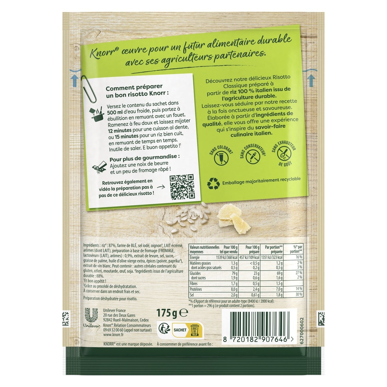 Nr. 1 in Italien* – entdecken Sie unser köstliches Knorr Classic Risotto, zubereitet mit 100 % nachhaltig angebautem italienischem Reis. Lassen Sie sich von unserem cremigen und aromatischen Rezept verführen. Hergestellt aus hochwertigen Zutaten, bietet es Ihnen ein Erlebnis, inspiriert von italienischer Kochkunst. Knorr Risotto hat den Nährwert B und ist frei von Konservierungsstoffen und Geschmacksverstärkern. Es ist reich an Geschmack und köstlich cremig. Es enthält 2 Portionen. Die Verpackung dieses Fertiggerichts ist größtenteils recycelbar. So bereiten Sie ein gutes Knorr Risotto zu: Geben Sie den Inhalt des Beutels in 500 ml kaltes Wasser und bringen Sie es unter regelmäßigem Rühren mit einem Schneebesen zum Kochen. Reduzieren Sie die Hitze und lassen Sie es 12 Minuten für al dente Reis oder 15 Minuten für gut durchgegarten Reis köcheln, wobei Sie gelegentlich umrühren. Sie müssen kein Salz hinzufügen. Für noch mehr Genuss: Geben Sie ein Stück Butter und etwas geriebenen Käse hinzu! Knorr® arbeitet gemeinsam mit seinen Partnerlandwirten an einer nachhaltigen Lebensmittelzukunft: Mehr als 95 % unserer landwirtschaftlichen Zutaten stammen bereits aus nachhaltigem Anbau. Wir möchten nun aktiv werden und unsere Ernährung schrittweise auf mehr Vielfalt und mehr Gemüse umstellen. Mit unseren Produkten, Rezepten und Tipps möchten wir Ihnen helfen, täglich kleine Veränderungen vorzunehmen, die den entscheidenden Unterschied machen. Lassen Sie uns gemeinsam eine bessere Lebensmittelzukunft gestalten! *Nielsen-Verkaufsdaten aus dem Jahr 2023.