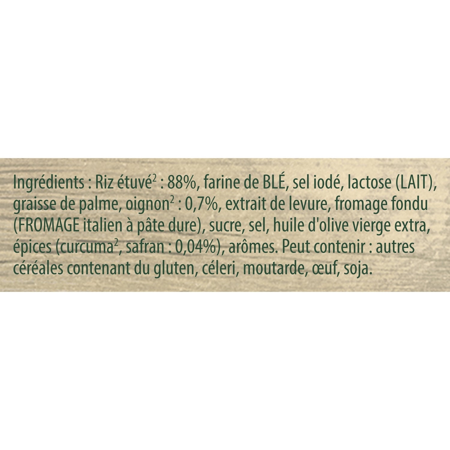 Zutaten: Parboiled-Reis2: 88%, WEIZENMEHL, jodiertes Speisesalz, Laktose (MILCH), Palmfett, Zwiebeln2: 0,7%, Hefeextrakt, Schmelzkäse (italienischer Hartkäse), Zucker, Salz, natives Olivenöl extra, Gewürze (Kurkuma2, Safran: 0,04%), Aromen. Kann enthalten: anderes GLUTENhaltiges Getreide, SELLERIE, SENF, EI, SOJA. 2Zutaten aus nachhaltiger Landwirtschaft: 89%.