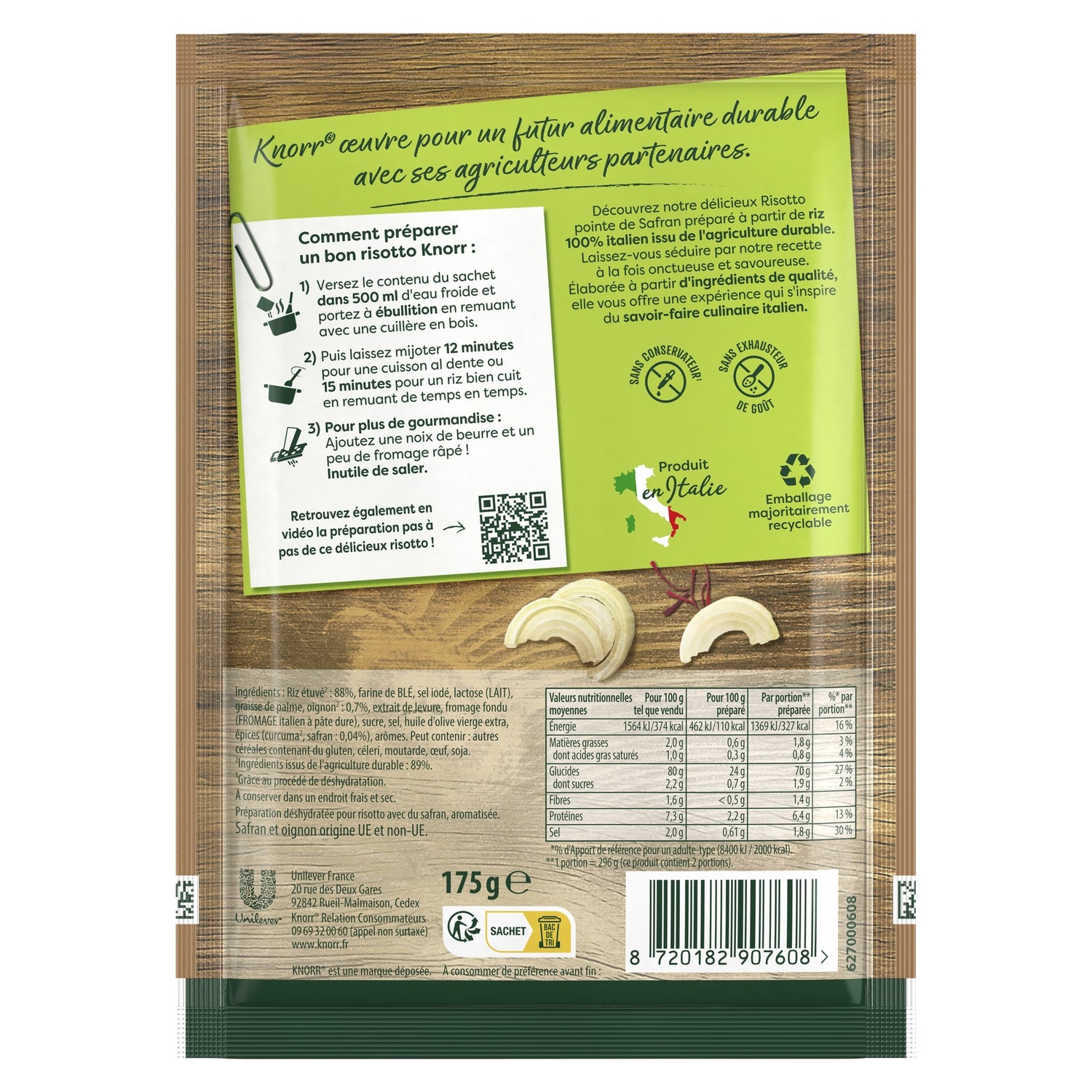 Nr. 1 in Italien*, entdecken Sie unser köstliches Knorr Safran-Risotto, zubereitet mit 100 % nachhaltig angebautem italienischem Reis. Lassen Sie sich von unserem cremigen und aromatischen Rezept verführen. Hergestellt aus Qualitätszutaten, bietet es Ihnen ein Erlebnis, inspiriert von italienischer Kochkunst. Knorr Risotto hat den Nährwert B und ist frei von Konservierungsstoffen und Geschmacksverstärkern. Es ist reich an Geschmack und köstlich cremig. Es enthält 2 Portionen. Die Verpackung dieses Fertiggerichts ist größtenteils recycelbar. So bereiten Sie ein gutes Knorr Risotto zu: Geben Sie den Inhalt des Beutels in 500 ml kaltes Wasser und bringen Sie es unter regelmäßigem Rühren mit einem Schneebesen zum Kochen. Reduzieren Sie die Hitze und lassen Sie es 12 Minuten für al dente Reis oder 15 Minuten für gut durchgegarten Reis köcheln, wobei Sie gelegentlich umrühren. Sie müssen kein Salz hinzufügen. Für noch mehr Genuss: Geben Sie ein Stück Butter und etwas geriebenen Käse hinzu! Knorr® arbeitet gemeinsam mit seinen Partnerlandwirten an einer nachhaltigen Lebensmittelzukunft: Mehr als 95 % unserer landwirtschaftlichen Zutaten stammen bereits aus nachhaltigem Anbau. Wir möchten nun aktiv werden und unsere Ernährung schrittweise auf mehr Vielfalt und mehr Gemüse umstellen. Mit unseren Produkten, Rezepten und Tipps möchten wir Ihnen helfen, täglich kleine Veränderungen vorzunehmen, die den entscheidenden Unterschied machen. Lassen Sie uns gemeinsam eine bessere Lebensmittelzukunft gestalten! *Nielsen-Verkaufsdaten aus dem Jahr 2023.