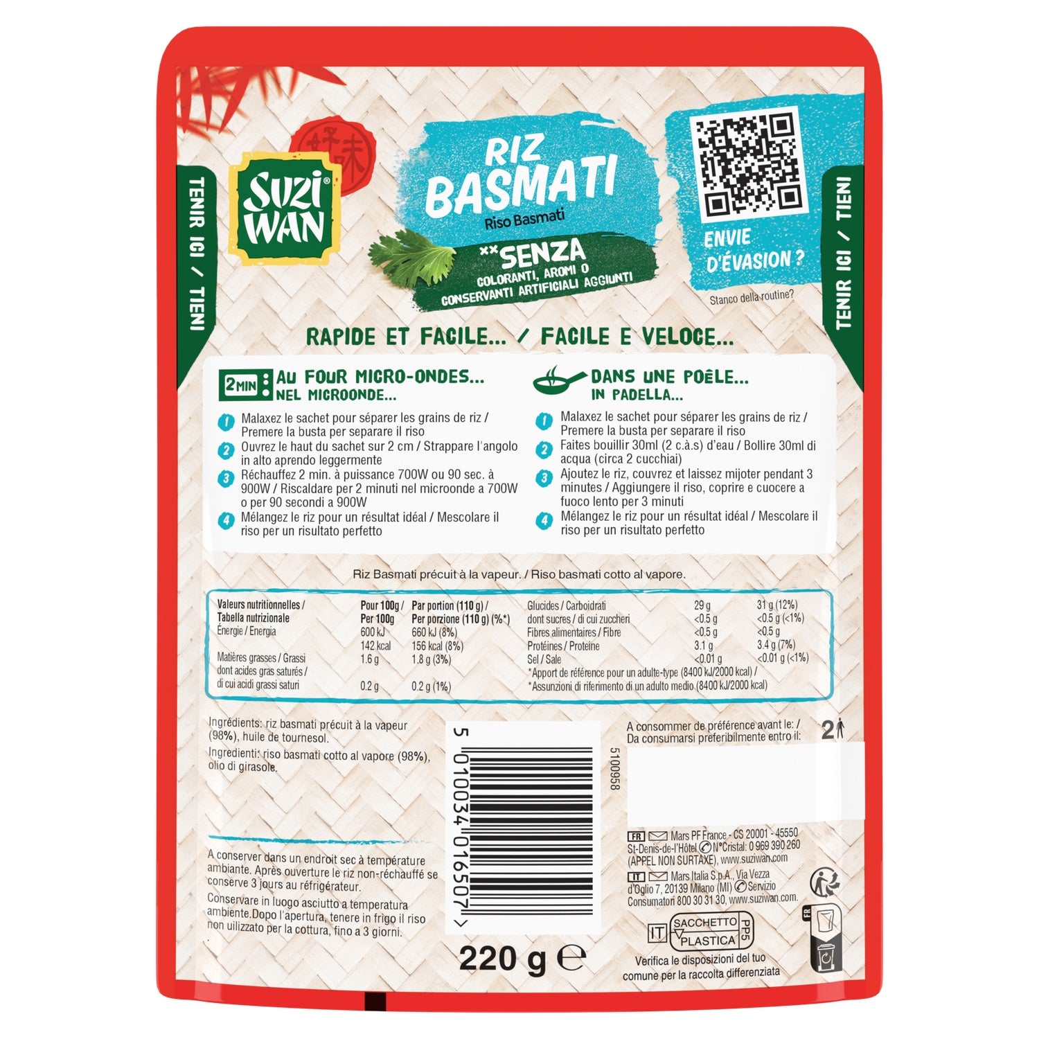 Basmati-Reis – Der absolute Hit. Entdecken Sie die Eleganz von Reis neu mit unserem Basmati, einem unverzichtbaren Klassiker mit raffiniertem Geschmack. Perfekt, um Ihren Gerichten eine authentische Note zu verleihen. Die neue Suzi Wan®-Reihe vorgekochter Reissorten ist ideal, um Ihre asiatischen Gelüste schnell zu stillen! Der Reis ist in 2 Minuten in der Mikrowelle oder im Topf fertig. Sie müssen nur noch Ihre Beilage wählen. Er ist frei von künstlichen Farb-, Aroma- und Konservierungsstoffen.