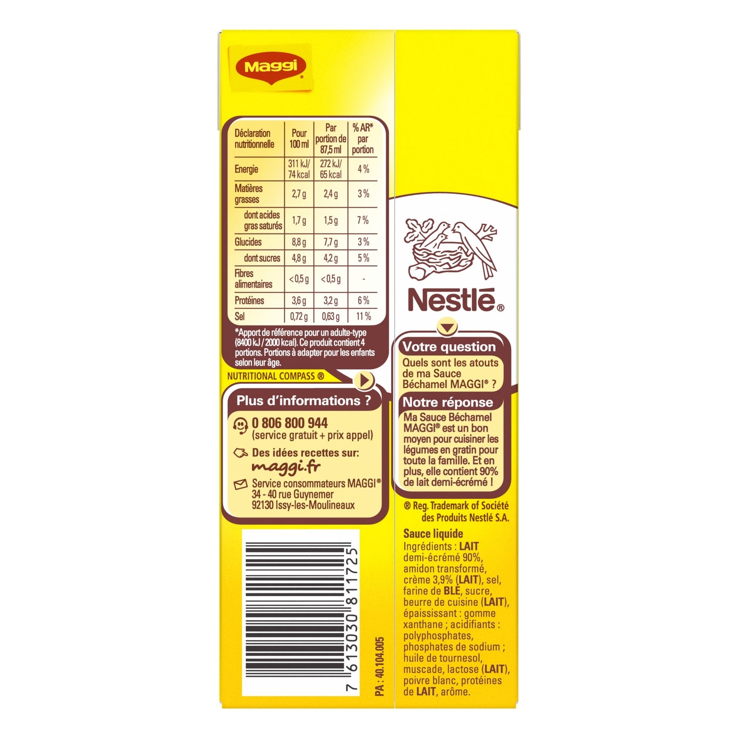 Entdecken Sie die flüssige Béchamelsauce von MAGGI, die unverzichtbare Zutat zum Verfeinern Ihrer Gratins, Pasta oder Lasagne! Diese cremige und perfekt gewürzte Sauce ist im Handumdrehen fertig und verleiht Ihren Gerichten einen intensiven Geschmack. Durch die Aufbewahrung im UHT-Behälter bleiben alle Aromen für Ihren größten Genuss erhalten. Außerdem enthält sie 91 % Milch!