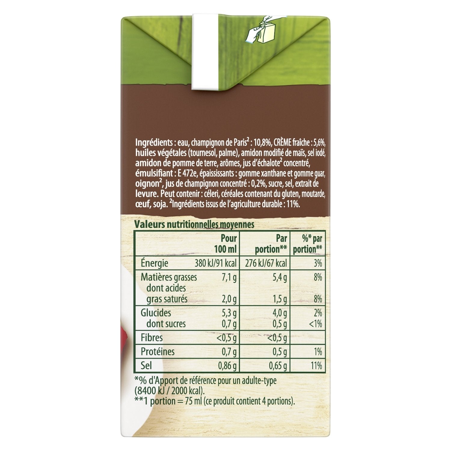 Zutaten: Wasser, Champignons: 10%, frische SAHNE: 5,6%, Pflanzenöle (Sonnenblume, Palm), modifizierte Maisstärke, Jodsalz, Aromen, Schalottensaftkonzentrat², Emulgator: E 472d, Champignonsaftkonzentrat: 0,2%, Verdickungsmittel: Xanthan und Guarkernmehl, Zucker, Salz, Hefeextrakt, Zwiebelpulver². Kann enthalten: Hafer, Weizen, SELLERIE, SENF, EI, Gerste, Roggen, SOJA. ²Zutaten aus nachhaltiger Landwirtschaft: 0,3%.