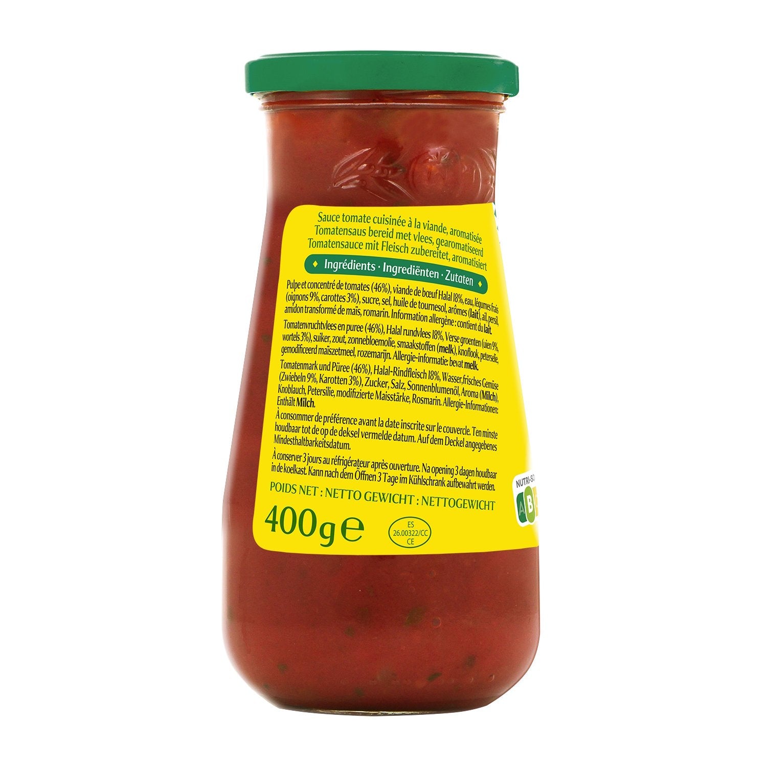 Tomatenmark und -konzentrat (46%), Halal-Rindfleisch 18%, Wasser, frisches Gemüse (Zwiebeln 9%, Karotten 3%), Zucker, Salz, Sonnenblumenöl, Aromen (MILCH), Knoblauch, Petersilie, verarbeitete Maisstärke, Rosmarin. Allergiehinweis: enthält *MILCH*.
