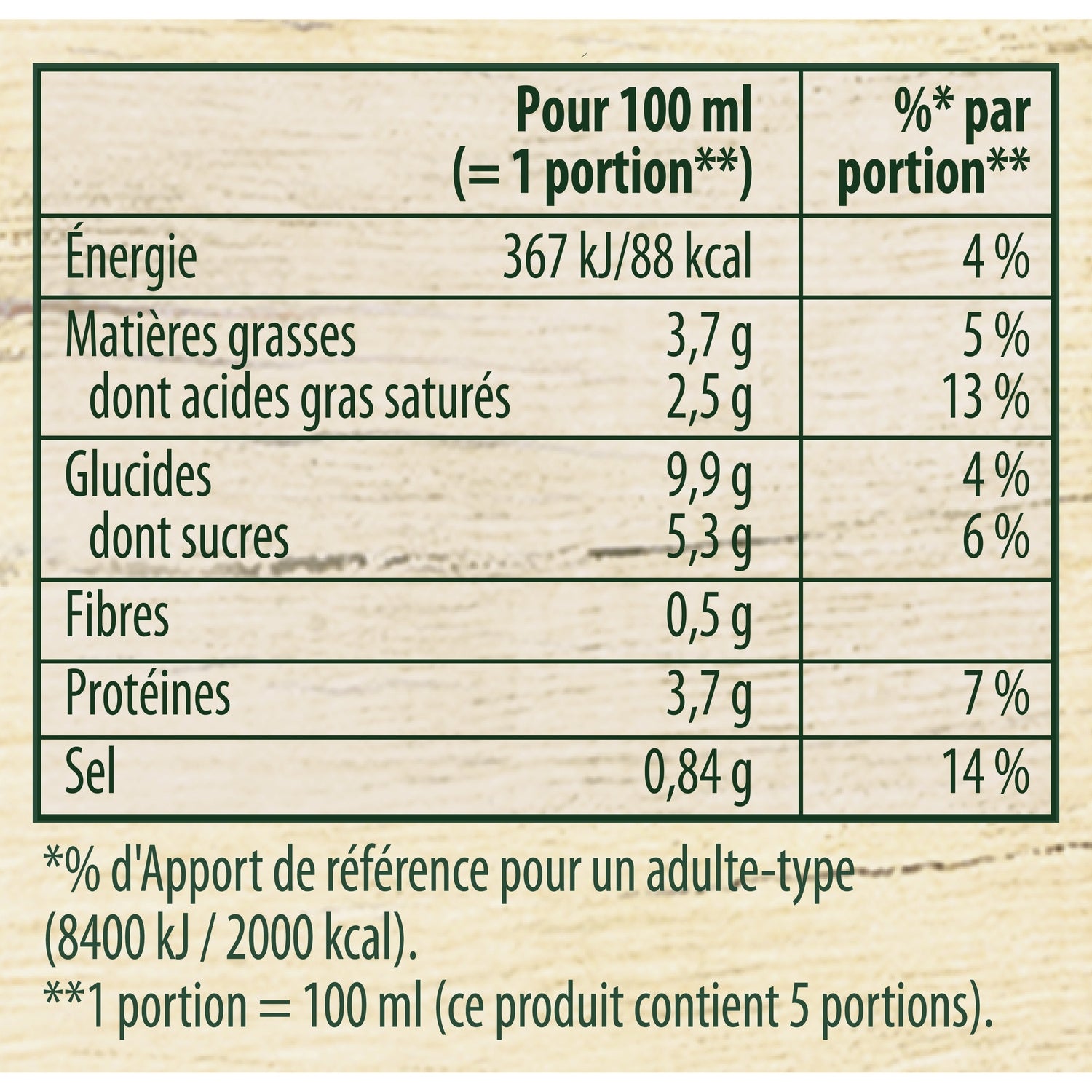 Brennwert (kJ): 367 kJ / 100 ml (4 %) | Brennwert (kcal): 88 kcal / 100 ml (4 %) | Fett: 3,7 g / 100 ml (5 %) | Gesättigte Fettsäuren: 2,5 g / 100 ml (13 %)