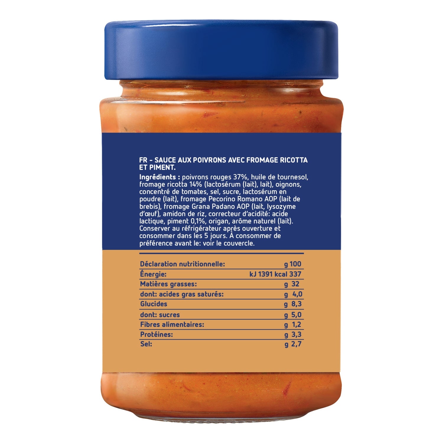 Rote Paprika 37 %, Sonnenblumenöl, Ricotta-Käse 14 % (Molke (MILCH), MILCH), Zwiebeln, Tomatenmark, Salz, Zucker, Molkenpulver (MILCH), Pecorino Romano DOP-Käse (SchafsMILCH), Grana Padano DOP-Käse (MILCH, EI-Lysozym), Reisstärke, Säureregulator: Milchsäure, Chili-Pfeffer 0,1 %, Oregano, natürliches Aroma (MILCH).