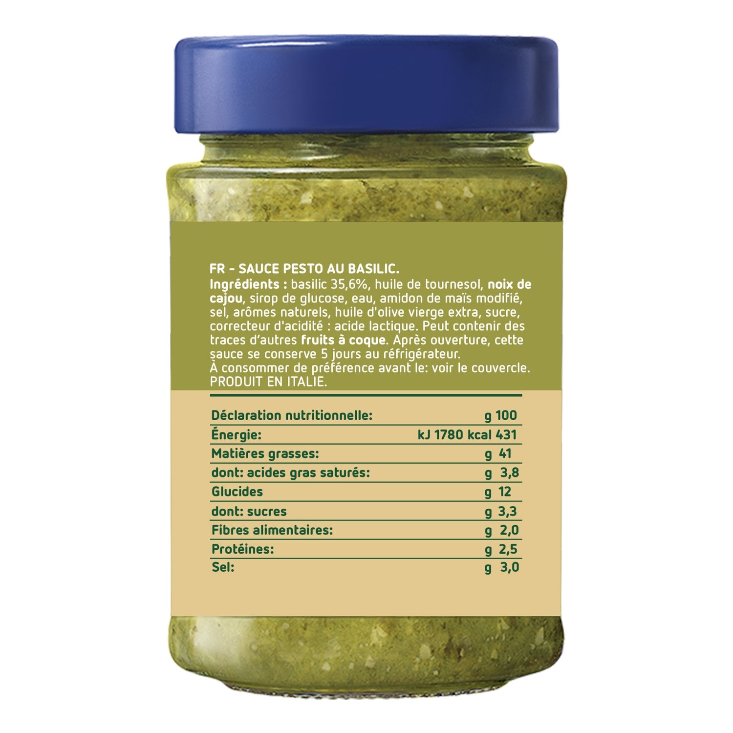 Basilikum 35,6%, Sonnenblumenöl, CASHEWNÜSSE, Glukosesirup, Wasser, modifizierte Maisstärke, Salz, natürliche Aromen, natives Olivenöl extra, Zucker, Säureregulator: Milchsäure. Kann Spuren von anderen NÜSSEN enthalten.
