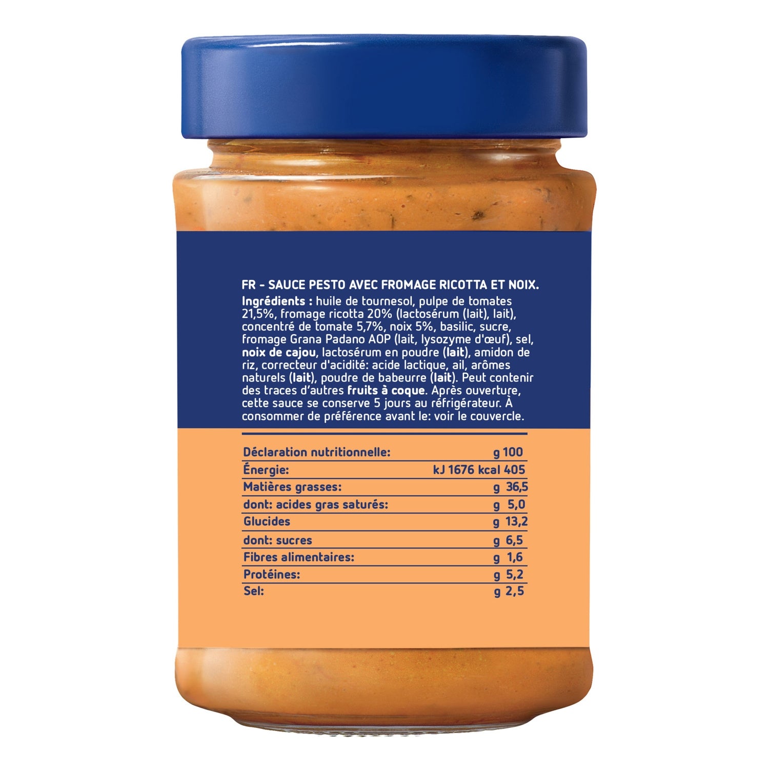 Sonnenblumenöl, Tomatenmark 21,5 %, Ricotta 20 % (Molke (MILCH), MILCH), Tomatenmark 5,7 %, NÜSSE 5 %, Basilikum, Zucker, Grana Padano DOP-Käse (MILCH, EI-Lysozym), Salz, CASHEWNÜSSE, Molkenpulver (MILCH), Reisstärke, Säureregulator: Milchsäure, Knoblauch, natürliche Aromen (MILCH), Buttermilchpulver (MILCH). Kann Spuren von anderen NÜSSEN enthalten.
