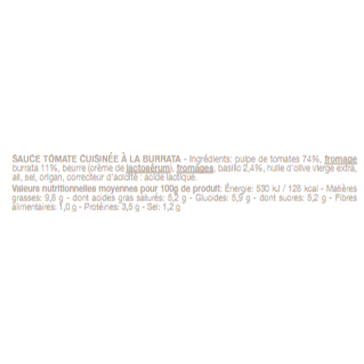 Zutaten: Tomatenmark 74 %, Burrata-KÄSE 11 %, Butter (Molkensahne), KÄSE, Basilikum 2,4 %, natives Olivenöl extra, Knoblauch, Salz, Oregano, Säureregulator: Milchsäure.