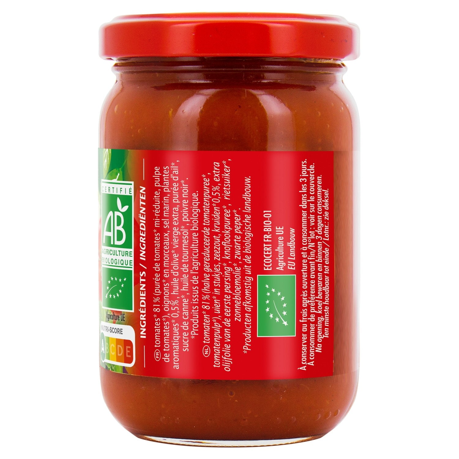 Zutaten: Tomaten* 81% (halbreduziertes Tomatenpüree*, Tomatenmark*), gehackte Zwiebeln*, Meersalz, aromatische Pflanzen* 0,5%, natives Olivenöl extra*, Knoblauchpüree*, Rohrzucker*, Sonnenblumenöl*, schwarzer Pfeffer*. *Produkte aus biologischem Anbau. Kann Spuren von SELLERIE enthalten.