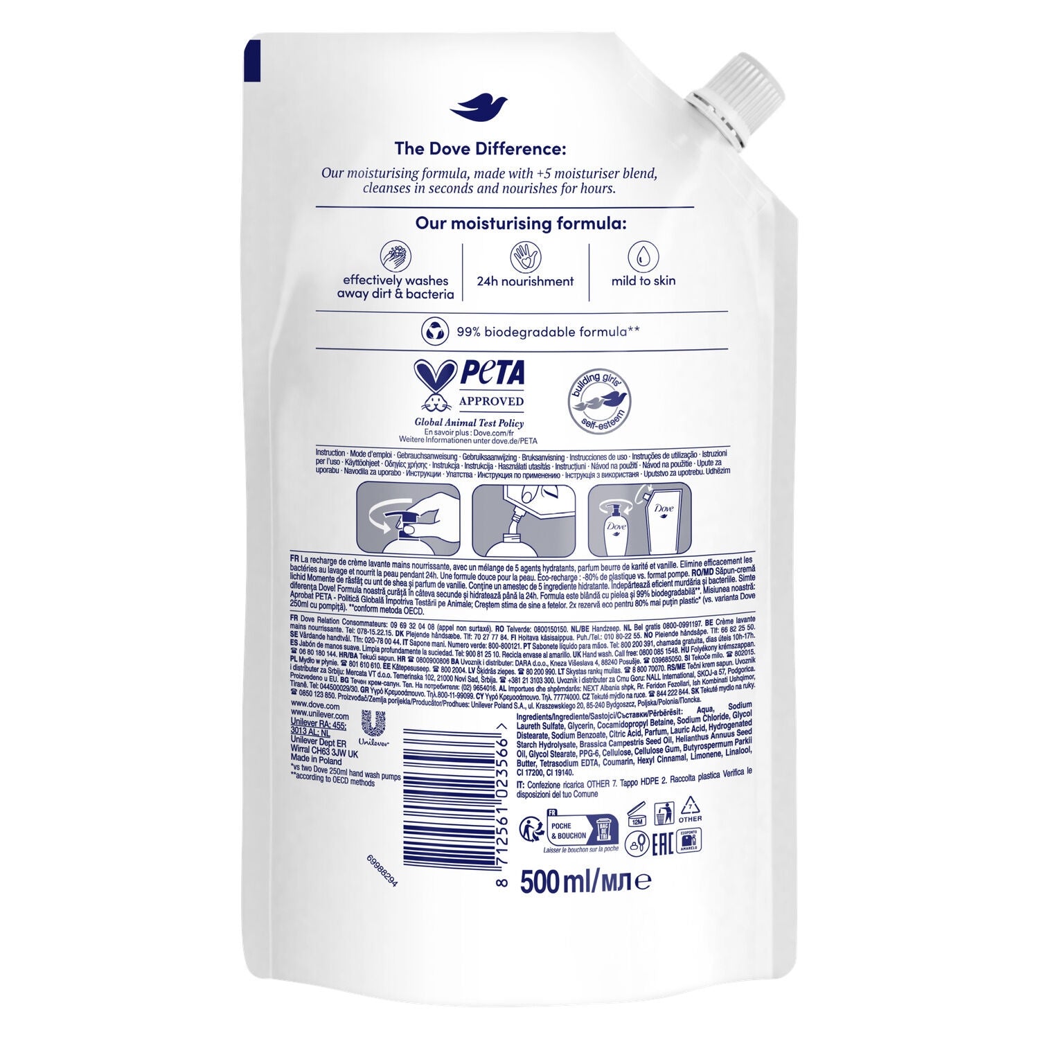 Die flüssige Handseife mit Sheabutter und Vanille von Dove im 500-ml-Nachfüllformat wäscht, schützt und befeuchtet Ihre Hände jeden Tag.,Diese flüssige Handseife enthält 5 Feuchtigkeitsspender, beseitigt Bakterien beim Waschen effektiv und schützt die Haut vor dem Austrocknen.,Die dermatologisch getestete flüssige Handseife von Dove pflegt Ihre Hände.,Die Formel dieser flüssigen Handseife enthält ¼ Feuchtigkeitscreme und Sheabutter für langanhaltende Pflege und sofortige Geschmeidigkeit.,Diese Reinigungscreme hinterlässt auf Ihren Händen einen weichen und wohltuenden Duft nach Sheabutter und Vanille.,Das Öko-Nachfüllformat der flüssigen Handseife mit Sheabutter und Vanille von Dove ist recycelbar und verwendet 80 % weniger Kunststoff als ein klassisches Pumpformat von Dove.