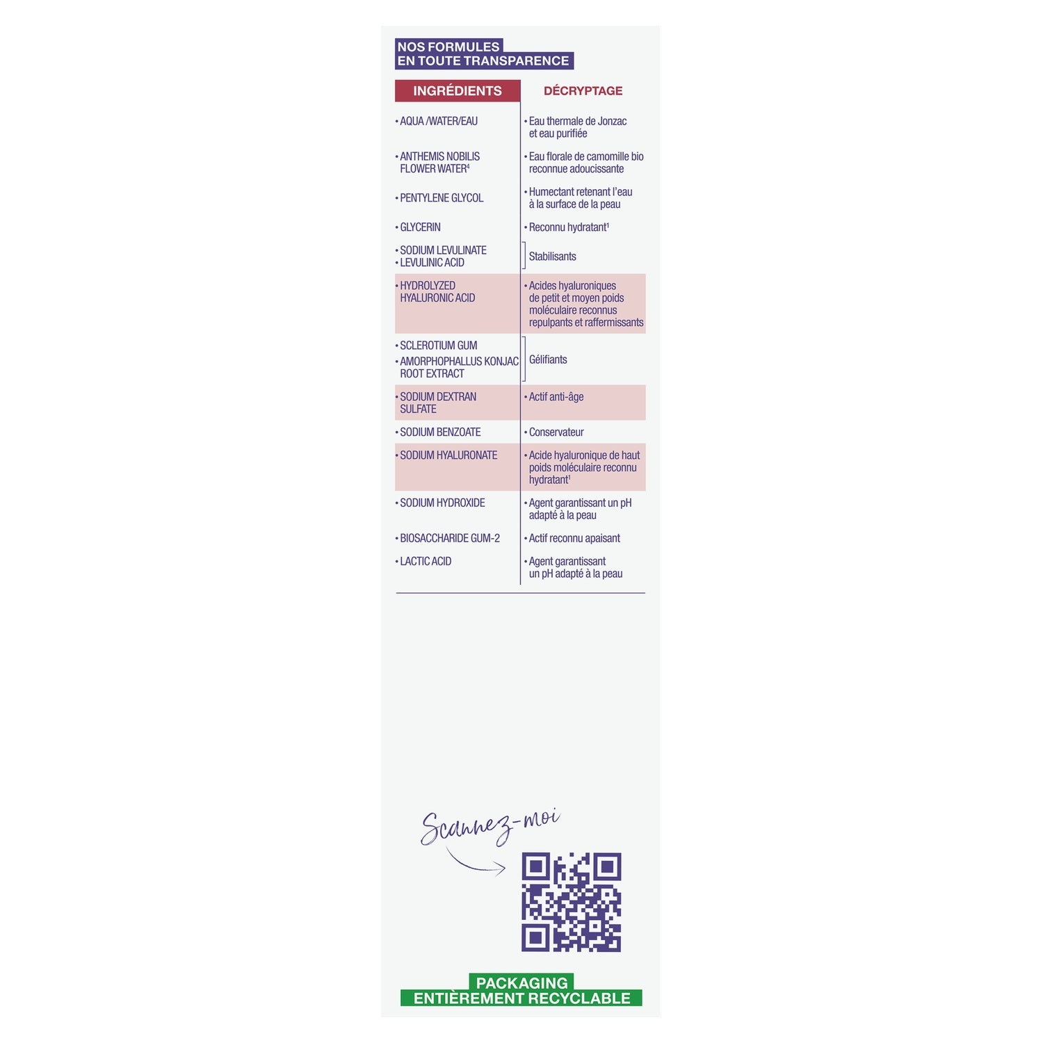 Inhaltsstoffe: Aqua/Wasser/Eau, Anthemis Nobilis Flower Water4, Pentylenglykol, Glycerin, Natriumlevulinat, Levulinsäure, hydrolysierte Hyaluronsäure, Sclerotium Gum, Amorphophallus Konjac-Wurzelextrakt, Natriumdextransulfat, Natriumbenzoat, Natriumhyaluronat, Natriumhydroxid, Biosaccharid Gum-2, Milchsäure.